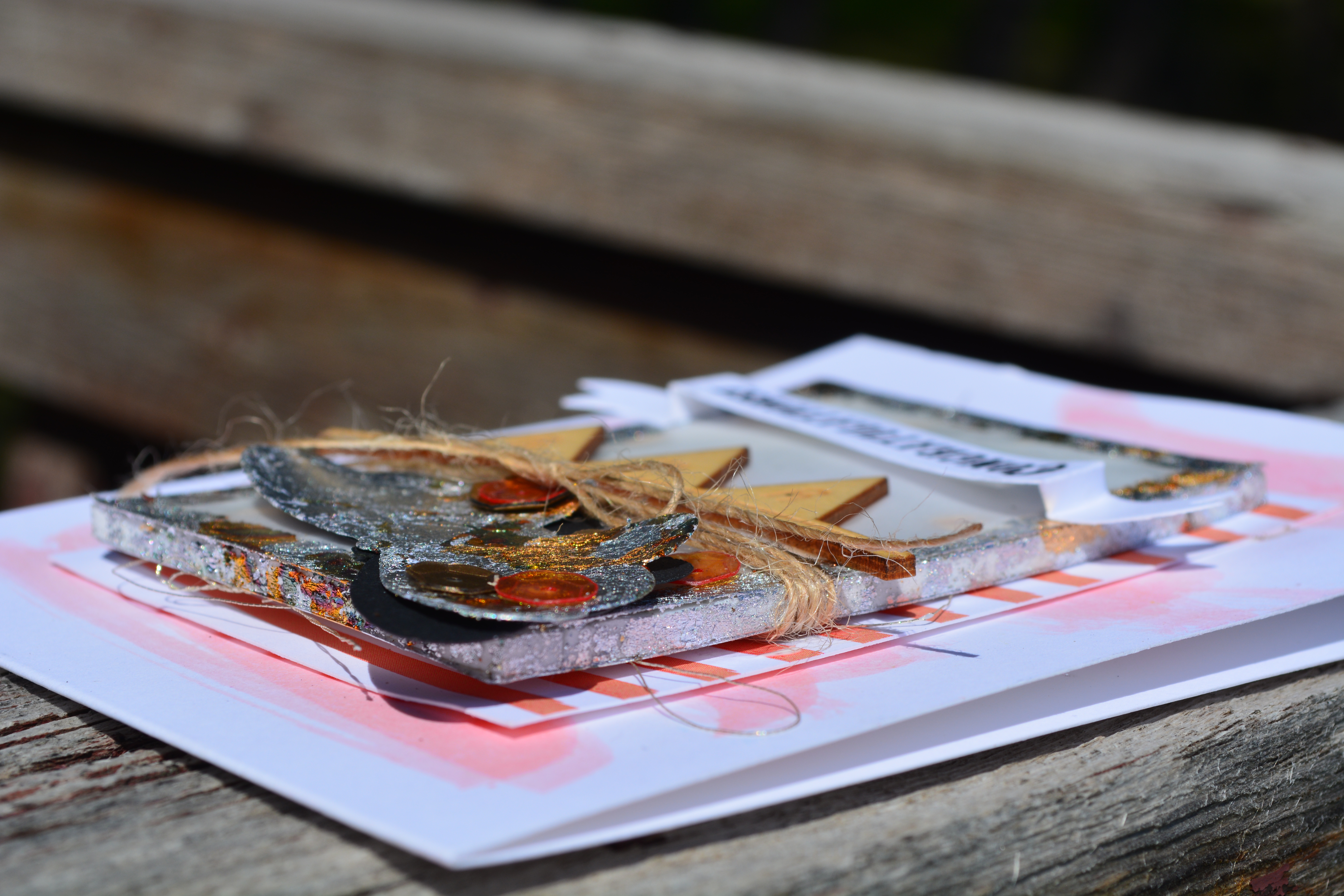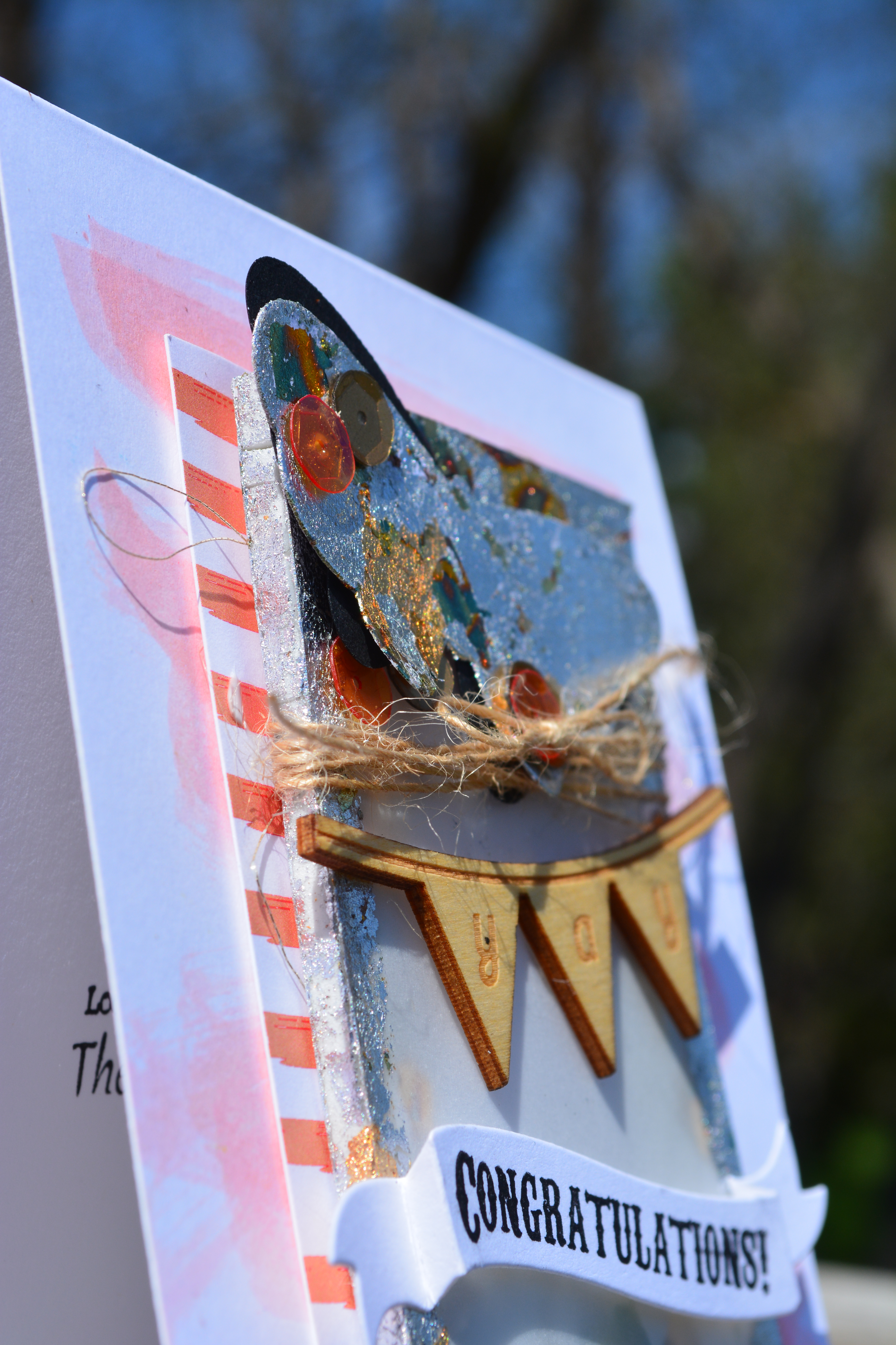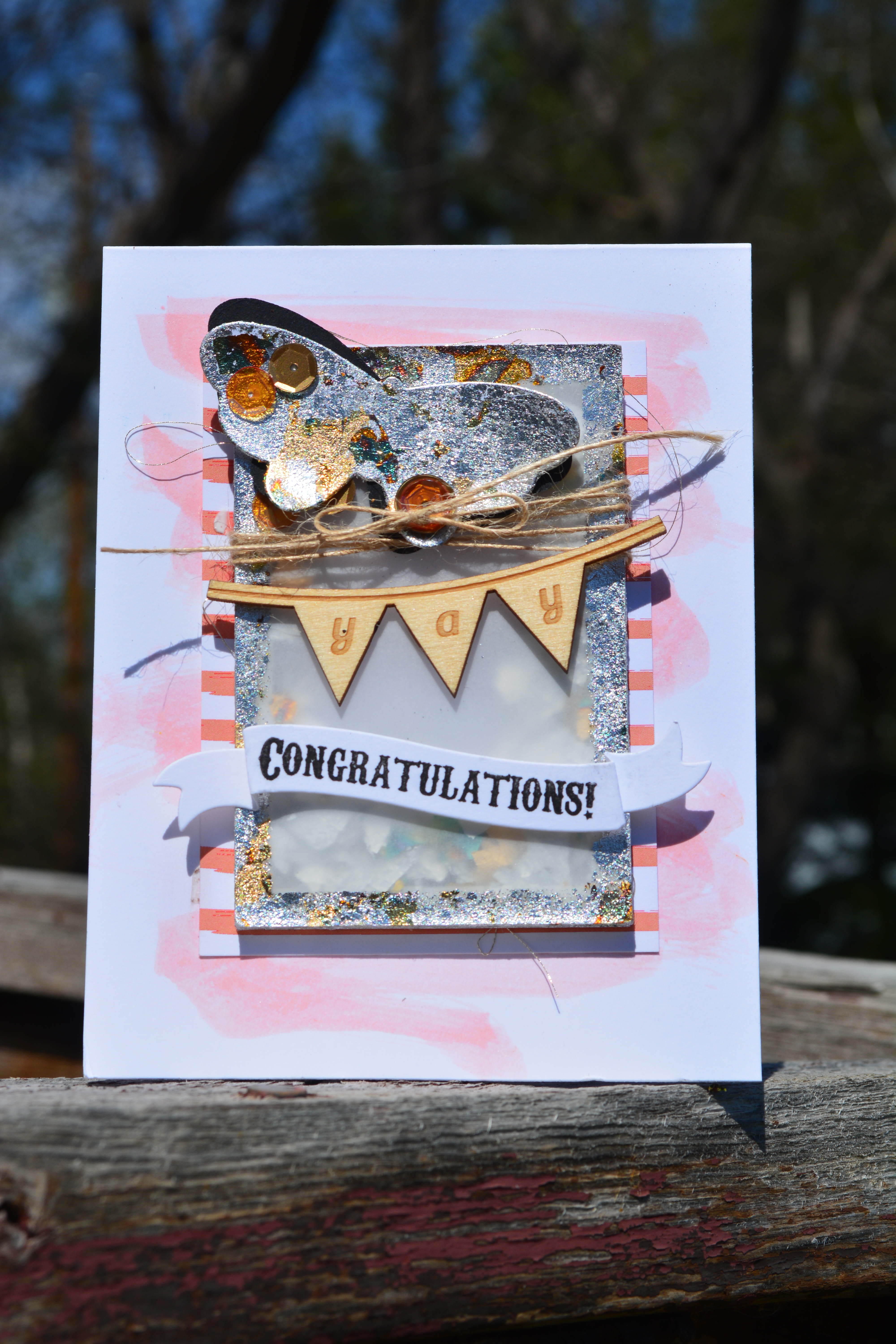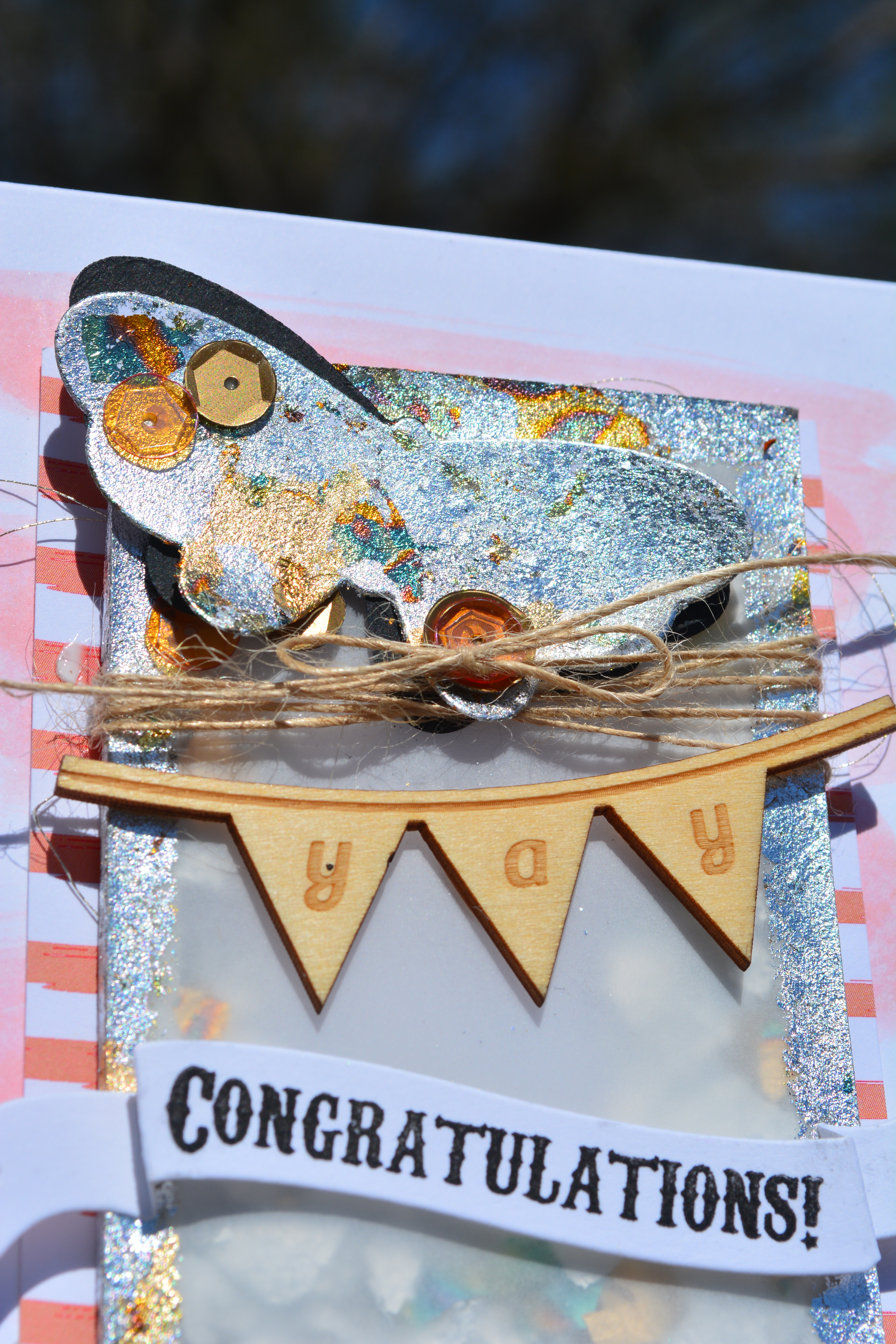 Here it is folks! My first project for the Scrapadabadoo Design Team. I got to play with the Indigoblu Kit in a Box, the gilding this creates is simply stunning and I am in love. Did you take notice that I made a shaker card with a vellum front and filled it with the mega flakes? I think it is so awesome that you can see them through, they move around its awesome.   DSC_0264   The shaker part of the card is 2 1/2″ x 3 3/4″, I used foam squares around the outside that are 1/4″ wide then created a mask for the center out of scrap paper 2″ x 3 1/4″, so that I could use flitterglue around it and on the sides of the foam and use the mega flakes on that as well. DSC_0265   The butterfly was covered in Flitterglu then I used the Mega Flakes on it as well. I then wrapped and tied some Twine, similar to the Burlap String around the shaker element and tied a pretty bow. The wood veneer saying yay is from my stash, I am not sure if you can use any fun little element here. Below it I stamped my sentiment on a banner I had die cut ages ago, you could easily cut a strip of paper, cut a V in each end and fold it to create a similar look.   DSC_0266   I then adheared the whole shaker onto a piece of scrap striped patterened paper, it looked like the cardbase needed something more to it so I took some Distress ink in Dried Marigold, and Worn Lipstick. Mixed those together and added a bunch of water and just did a light scribble of it with a brush right on the card base.   Thanks for stopping by Hugz Jess