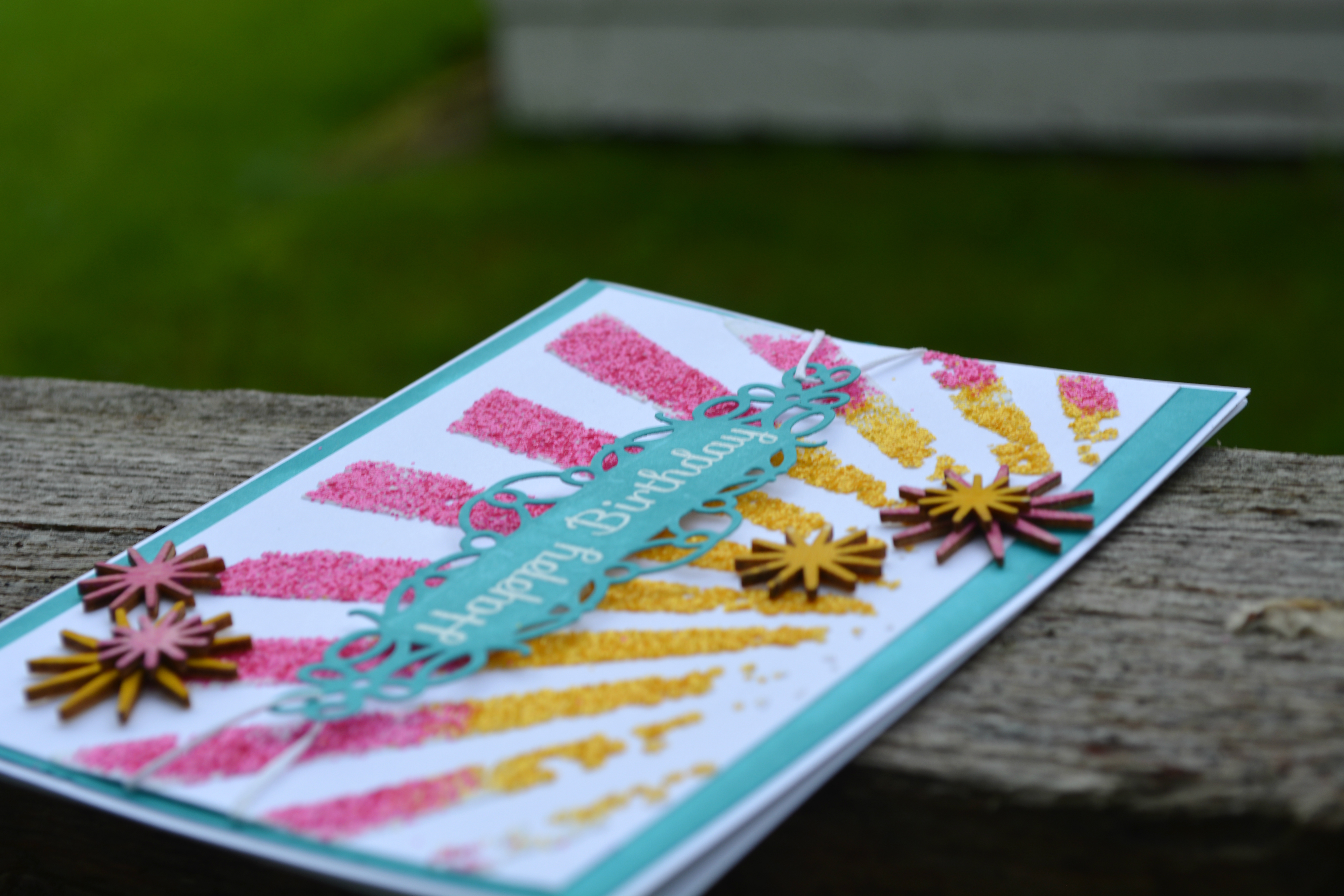 I then took Studio Calico Star Burst wood veneer (I can not find a link to these) and painted them with Distress Ink in Picked Raspberry, and Mustard Seed.