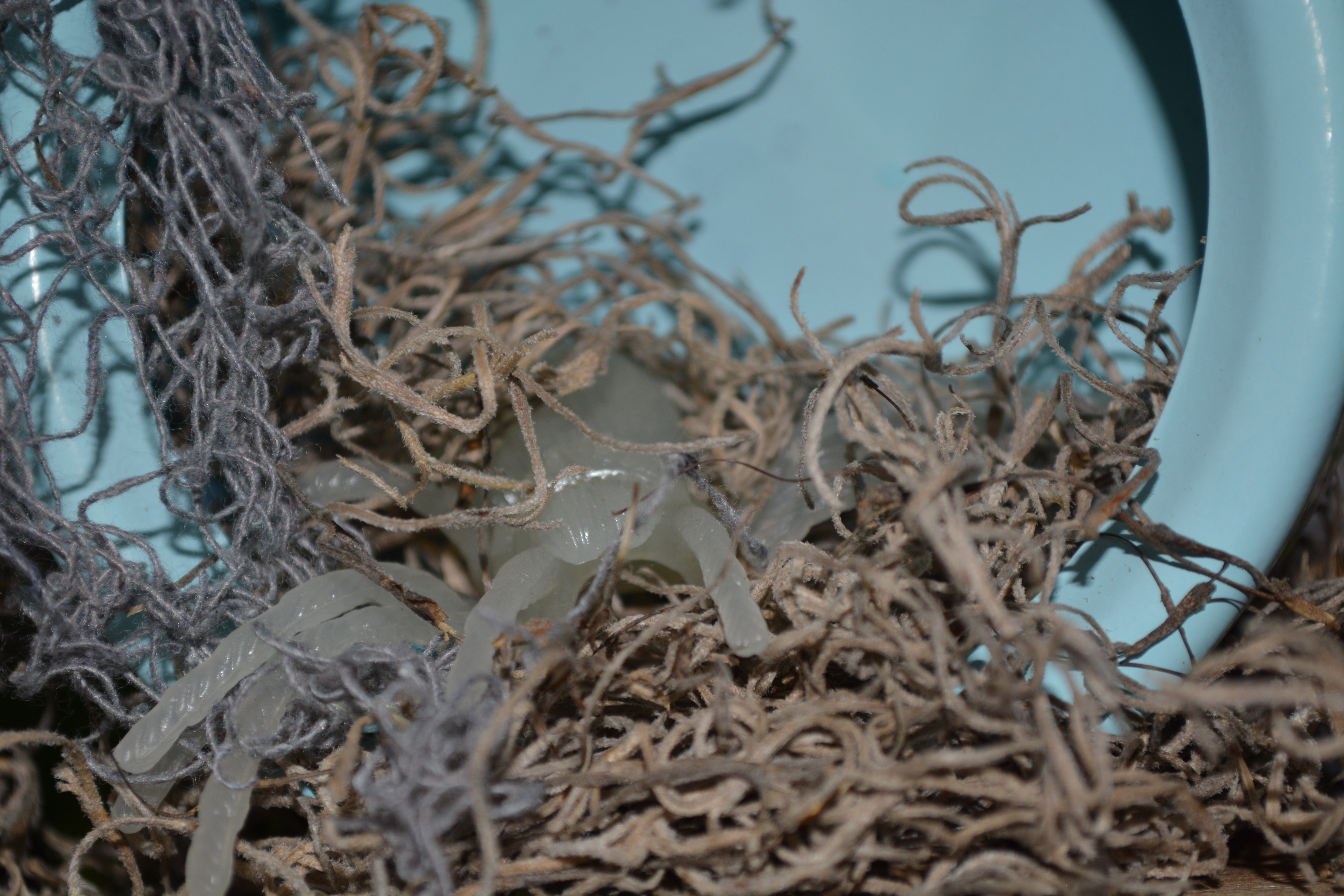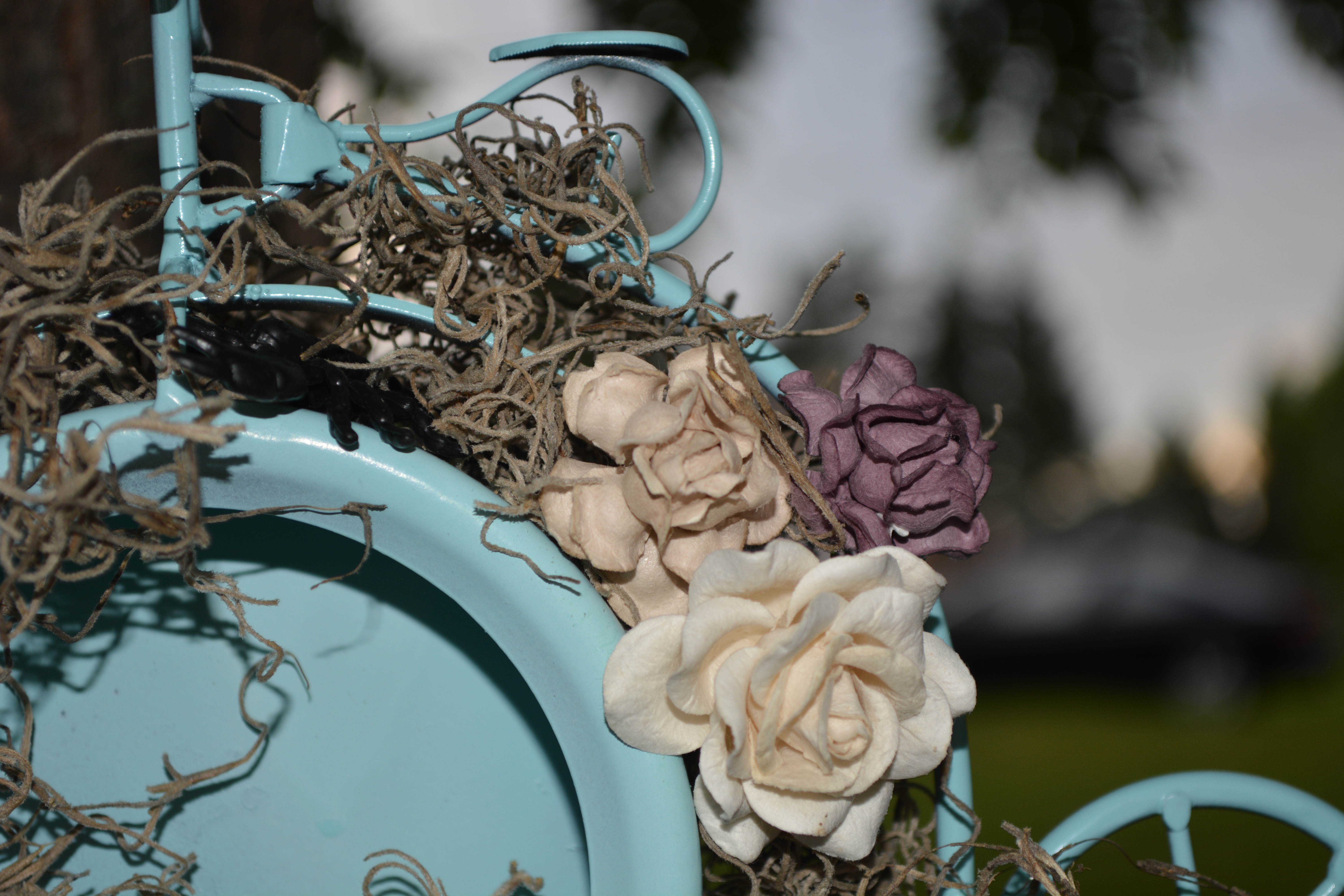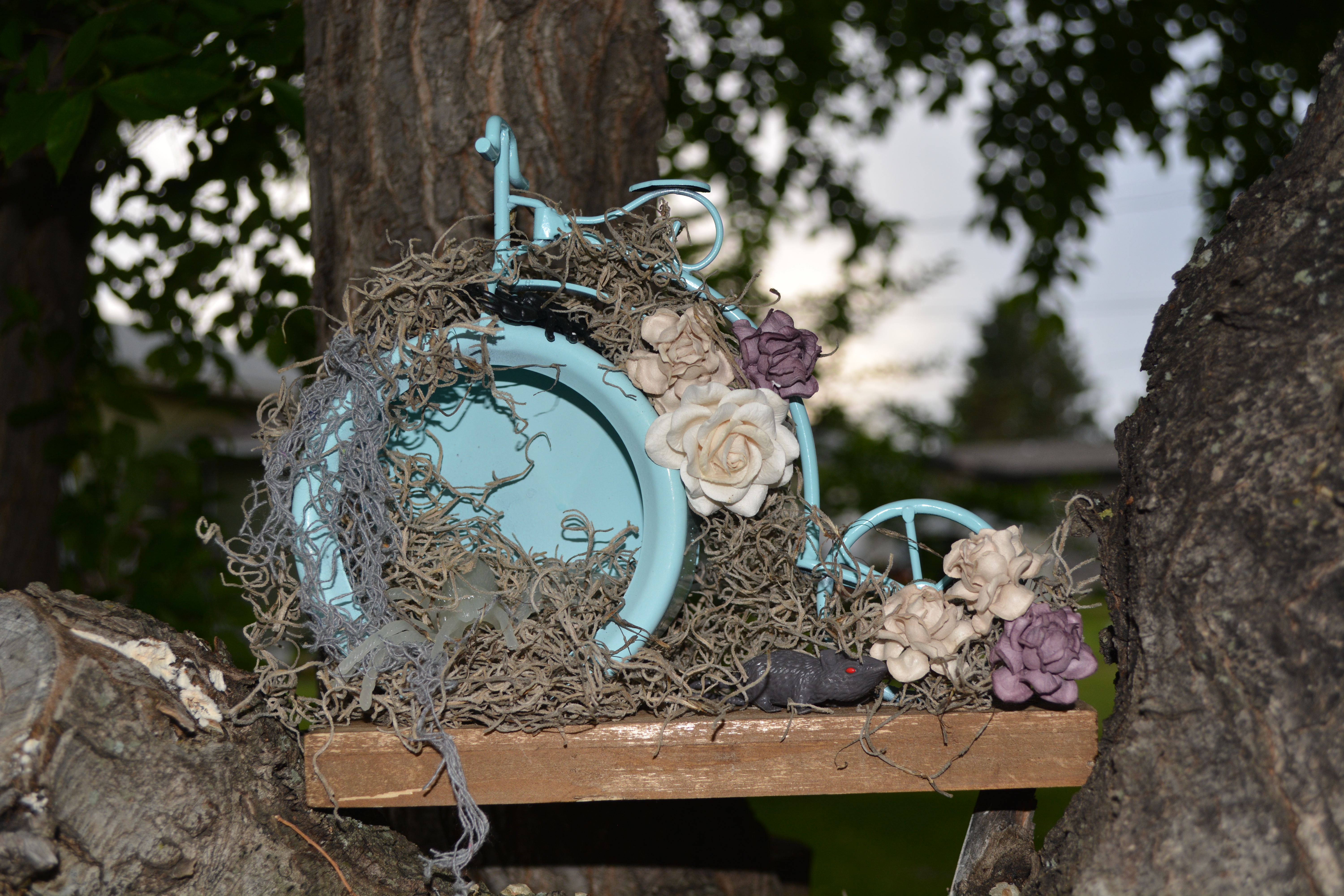 So it all started with me spray painting the bike with Krylon Colormaster paint and primer in one in the colour Blue Ocean Breeze, after a couple coats of that and letting it dry I was ready to have some fun… I picked myself up a bag of Spanish moss from Dollarama (Canadian dollar store) and covered the bike in it.. giving it that over grown feel. I then took some “Creepy cloth” out of my halloween decorations and cut myself off a chunk. The cloth is like a heavy cheese cloth with large holes in it, I draped that over the front end of the bike.