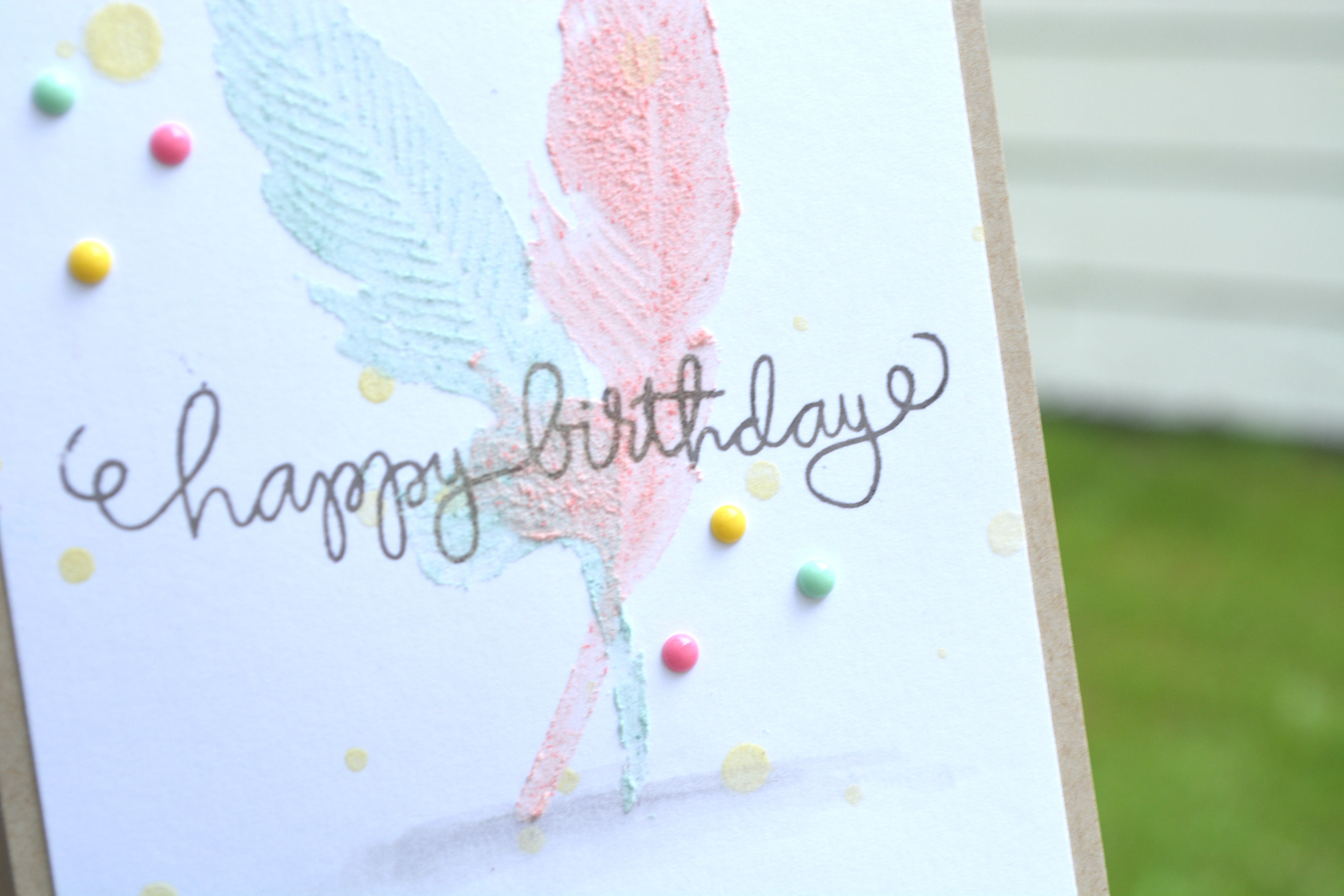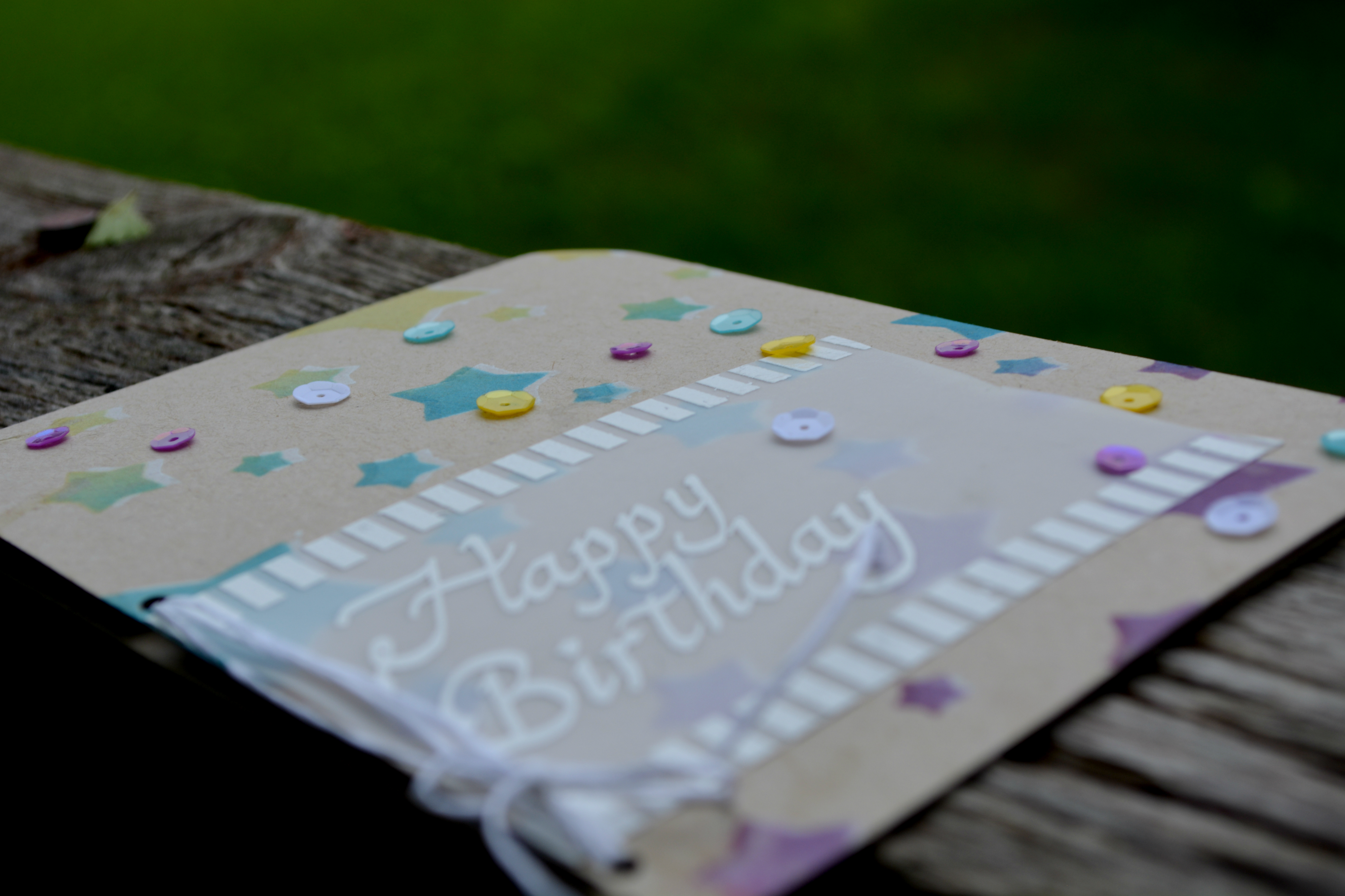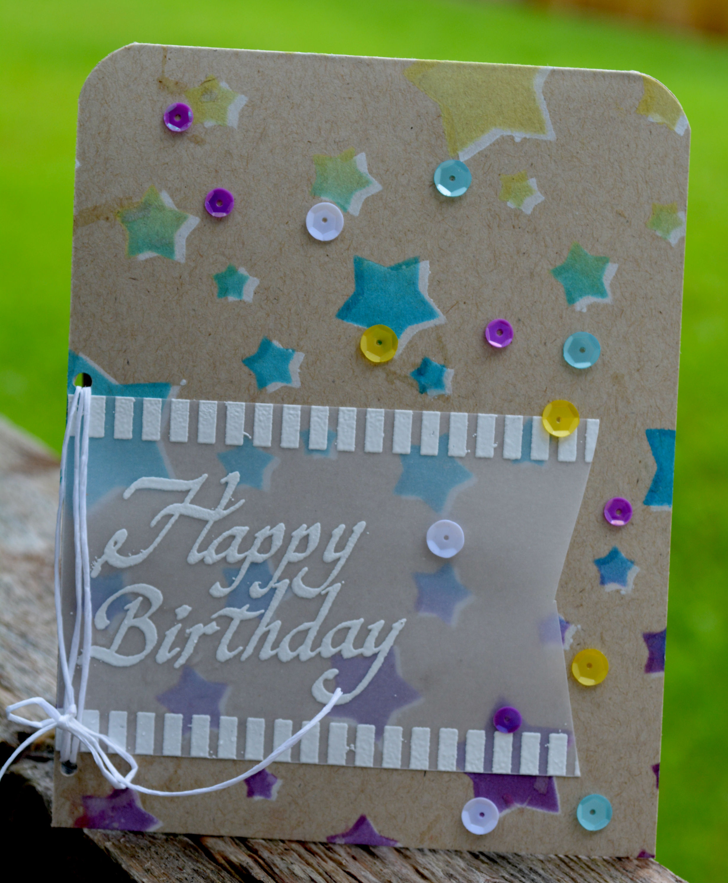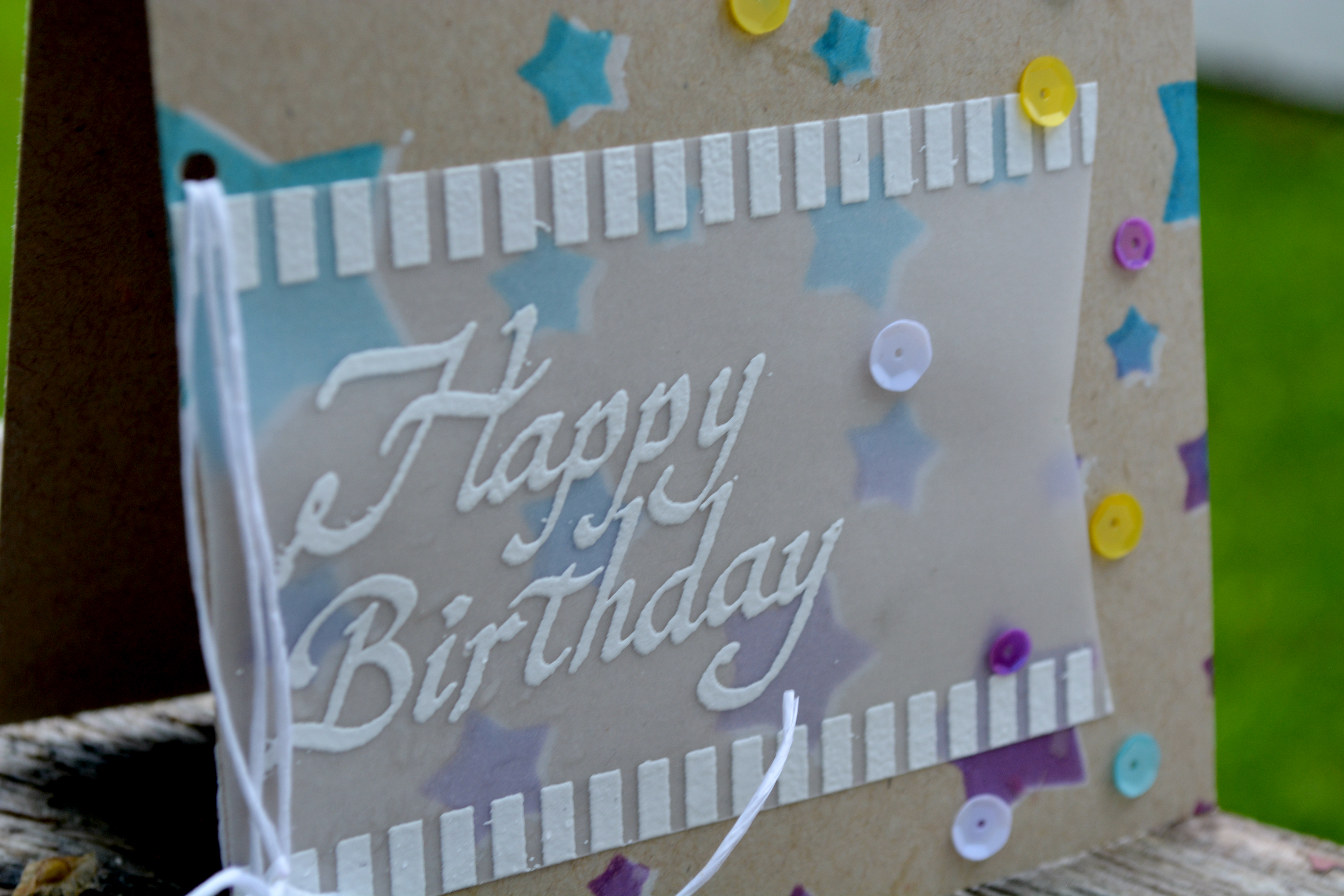 I then took a piece of vellum from my stash (it is provocraft vellum but Bazzil would work wonderfully), Heat embossed a happy birthday sentiment and a boarder from some stamp sets from my stash (I can’t remember which ones as I forgot to write them down, I appologize.) Cut a flag into the one side and glued it on, I then used white Scrappers Spool thread and wrapped it around a few times tying a bow. The sequins are from Neat and Tangled