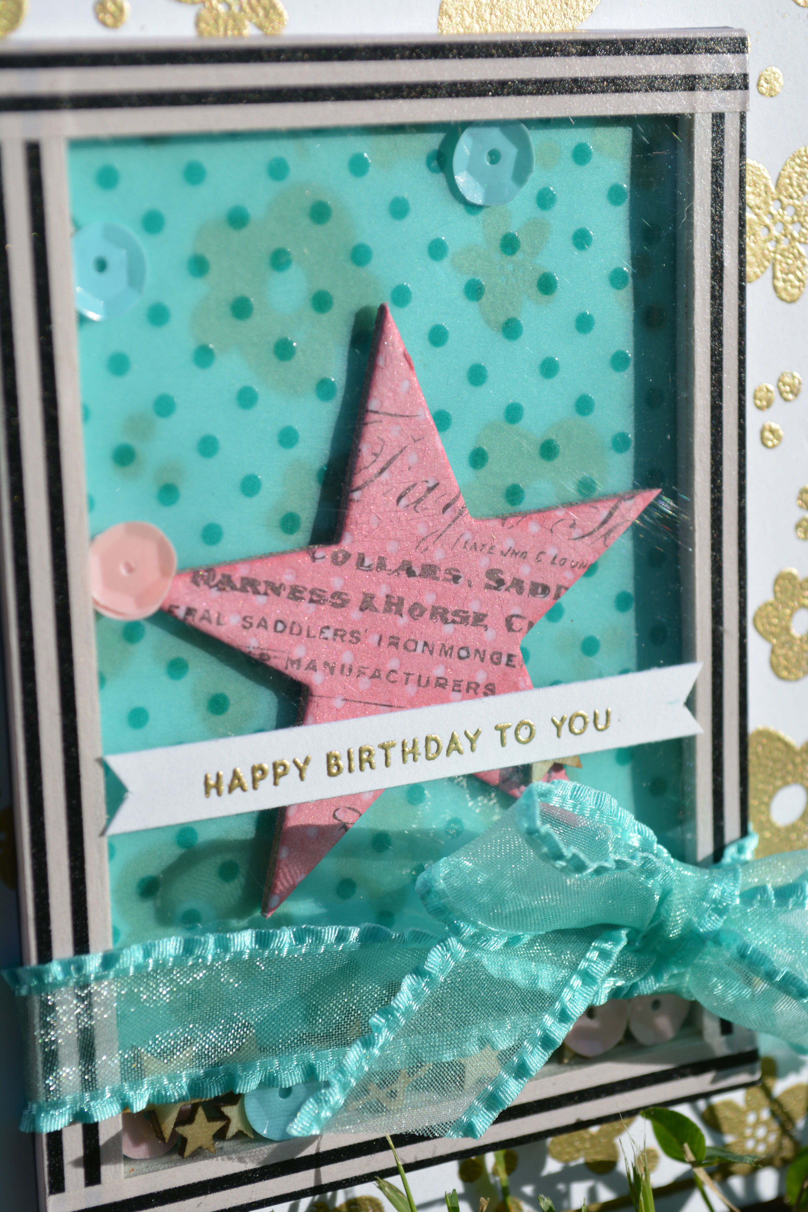I then made a bow on the front of the card using May Arts Turquoise Twill Stripes ribbon. Added a few enamel dots from my stash in similar colours, put it all on a white card base and the card was complete! Quick and simple.