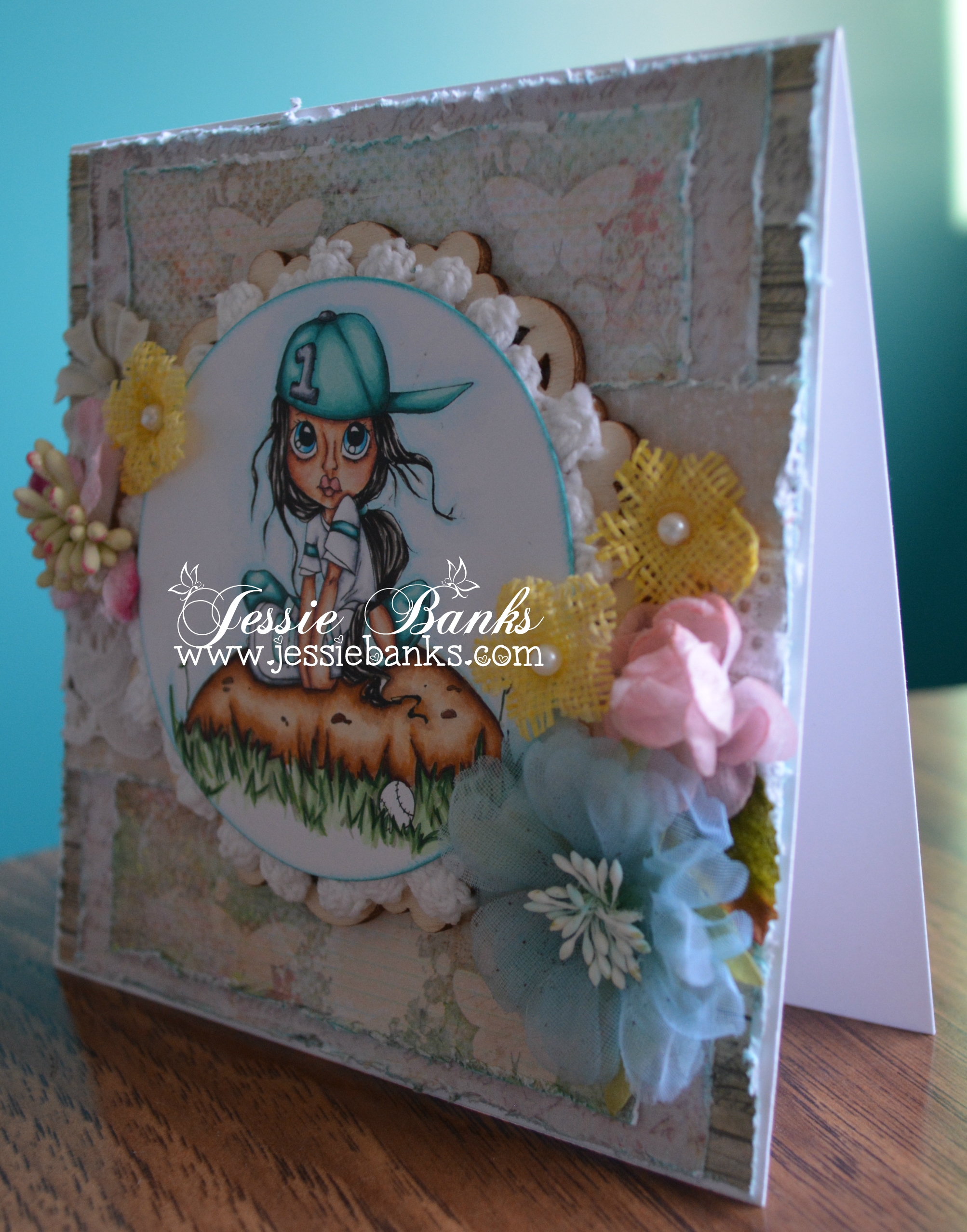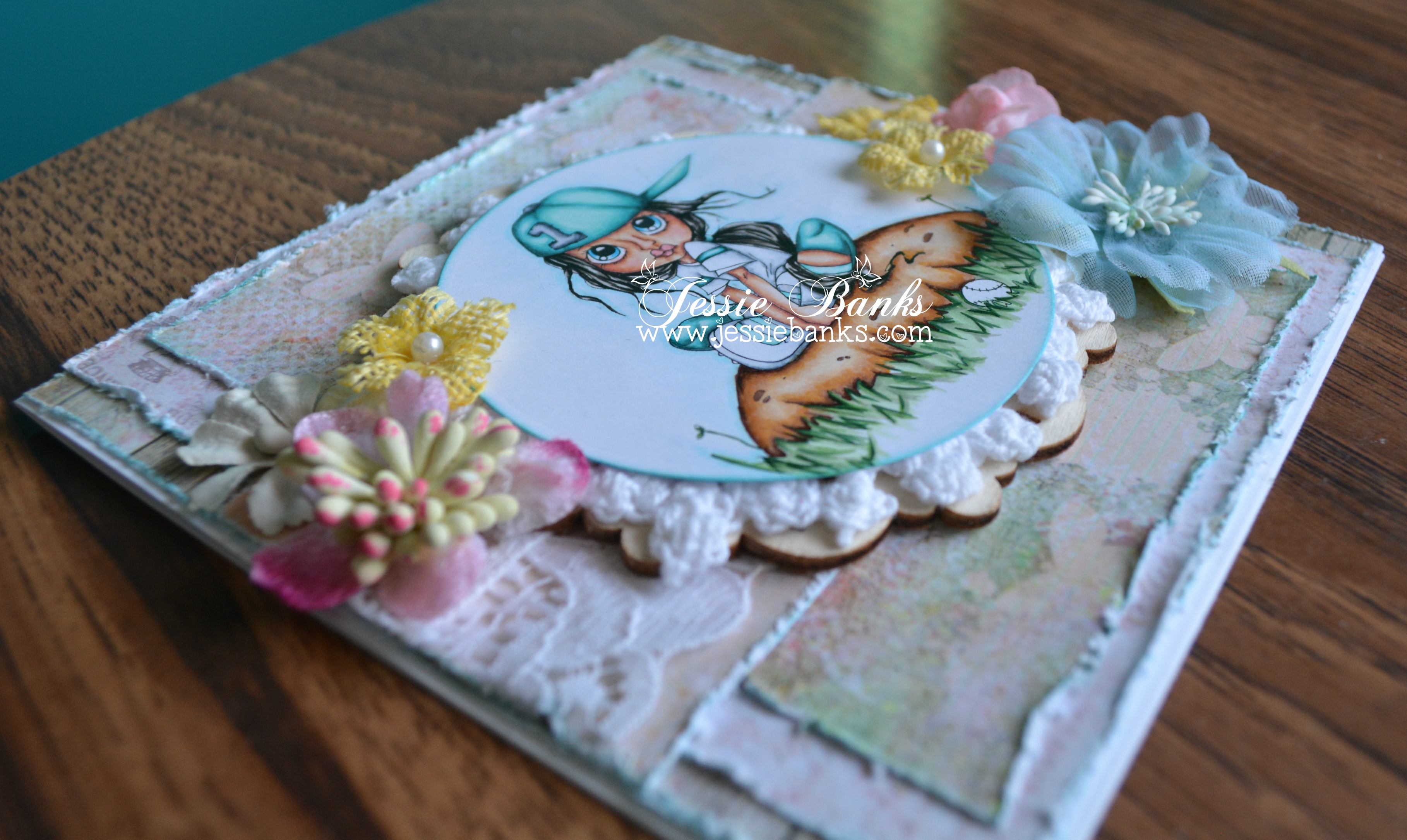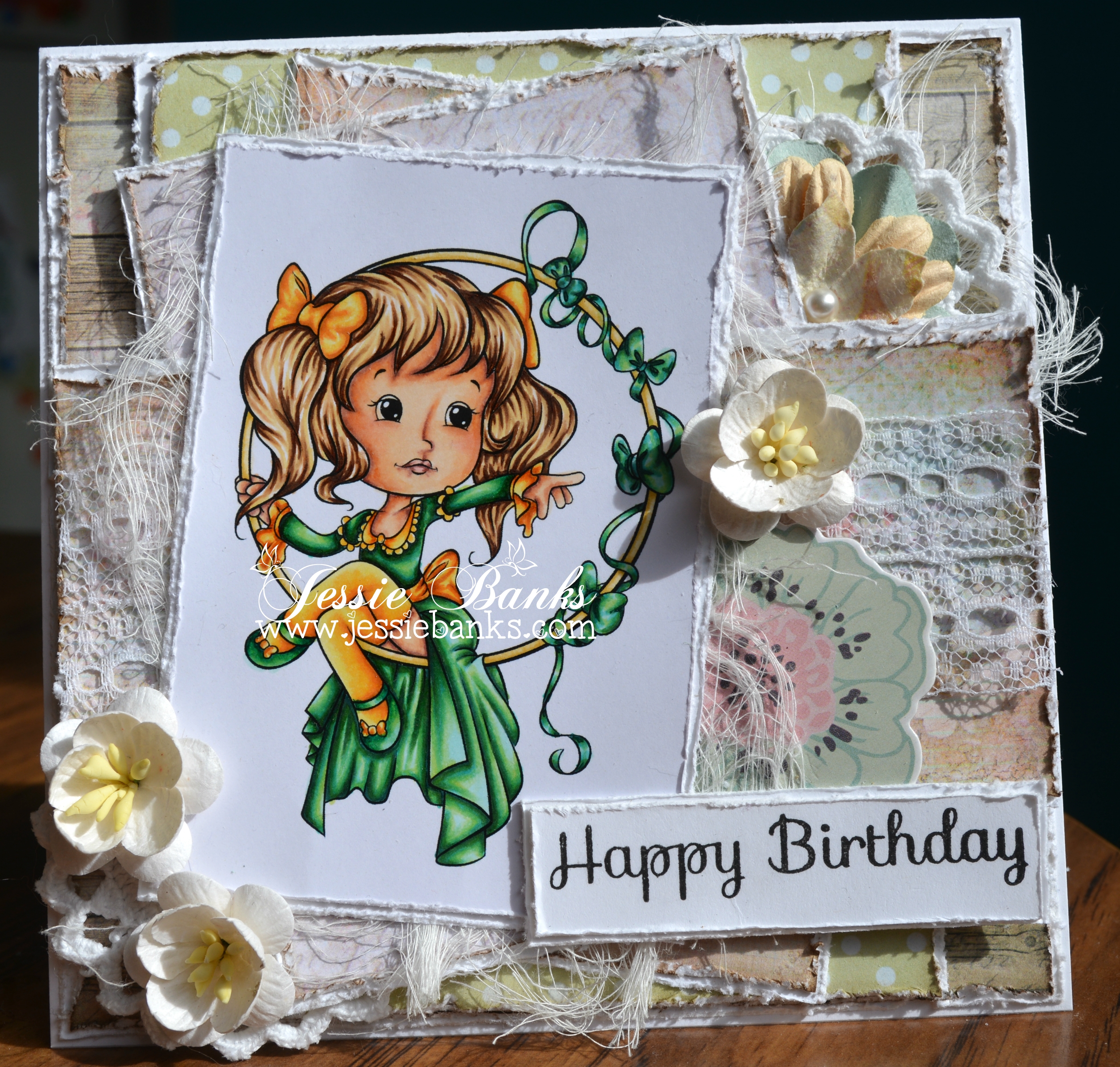 I coloured this image up with my copics and used a fun technique where I selectively die cut the image into a circle allowing the balloon to continue outside of the circle. Layered patterned paper, trim and flowers finish the card off.