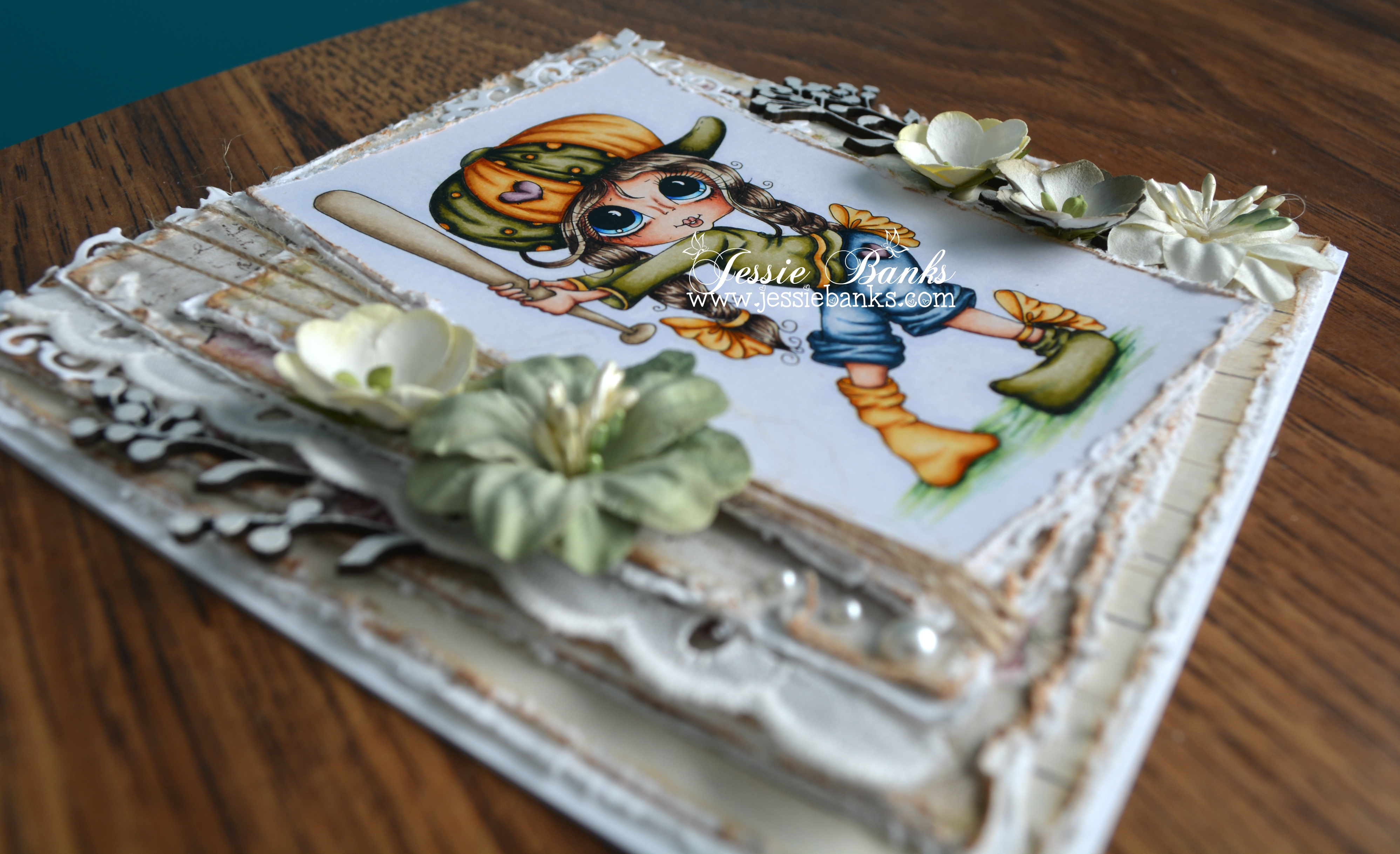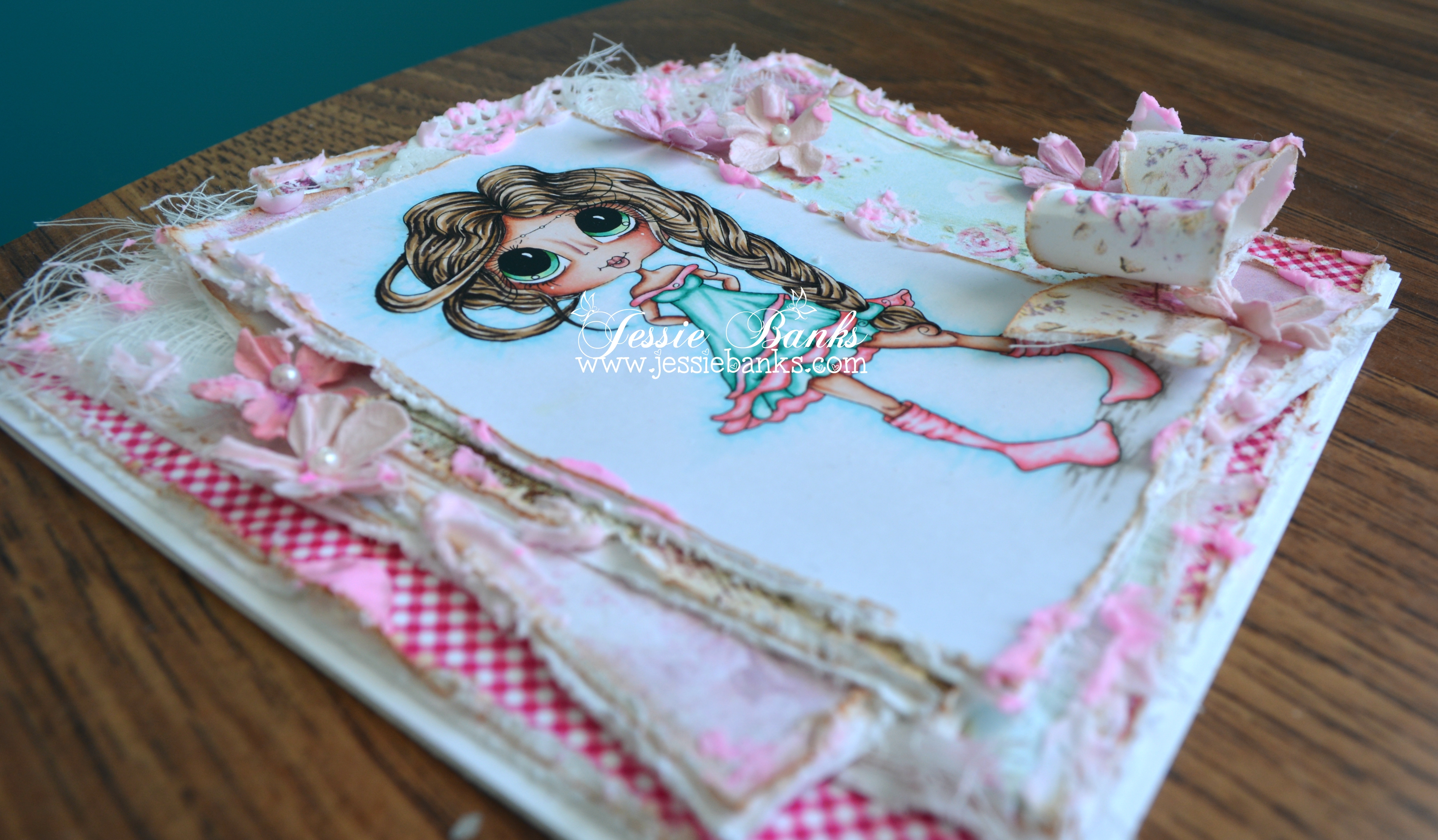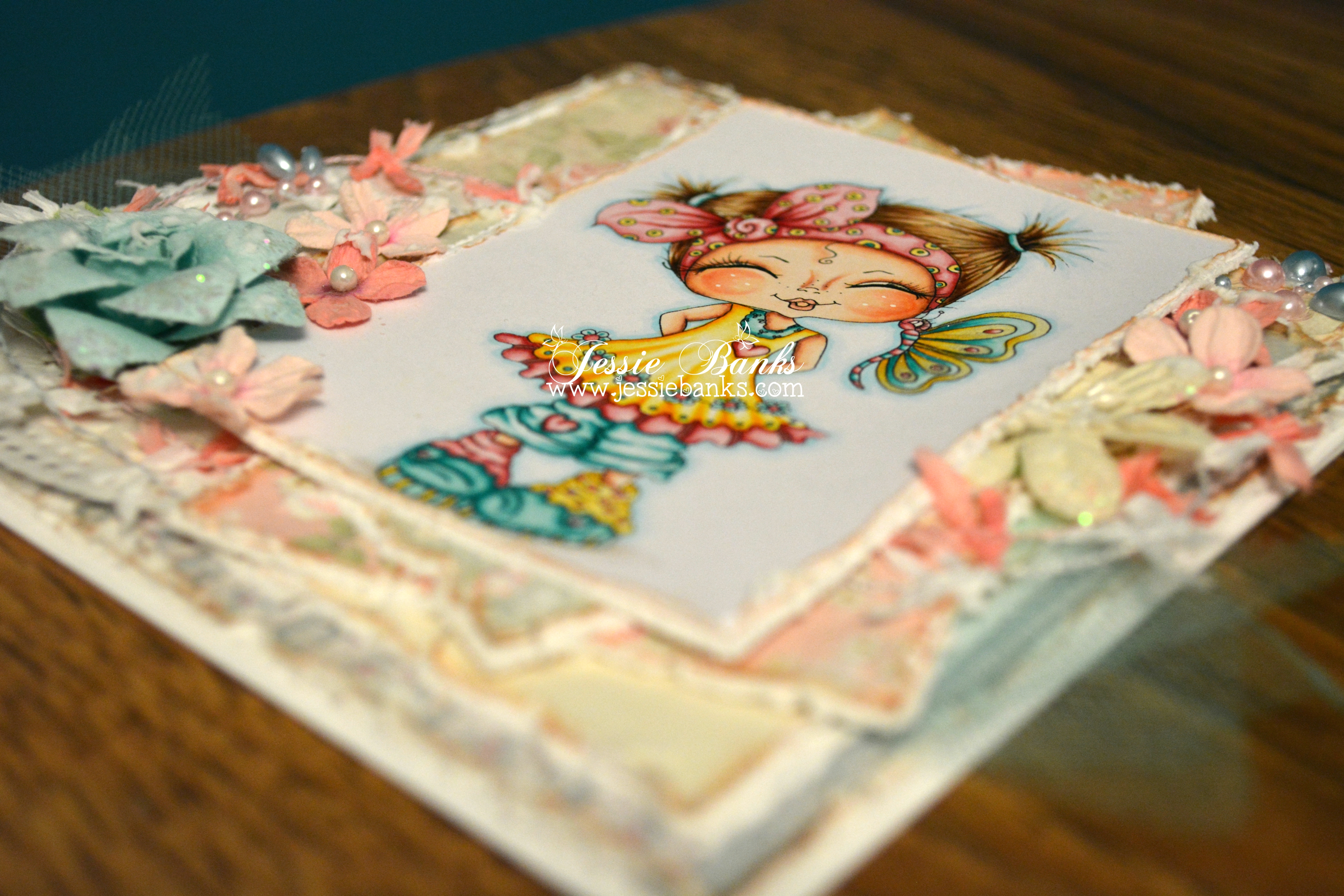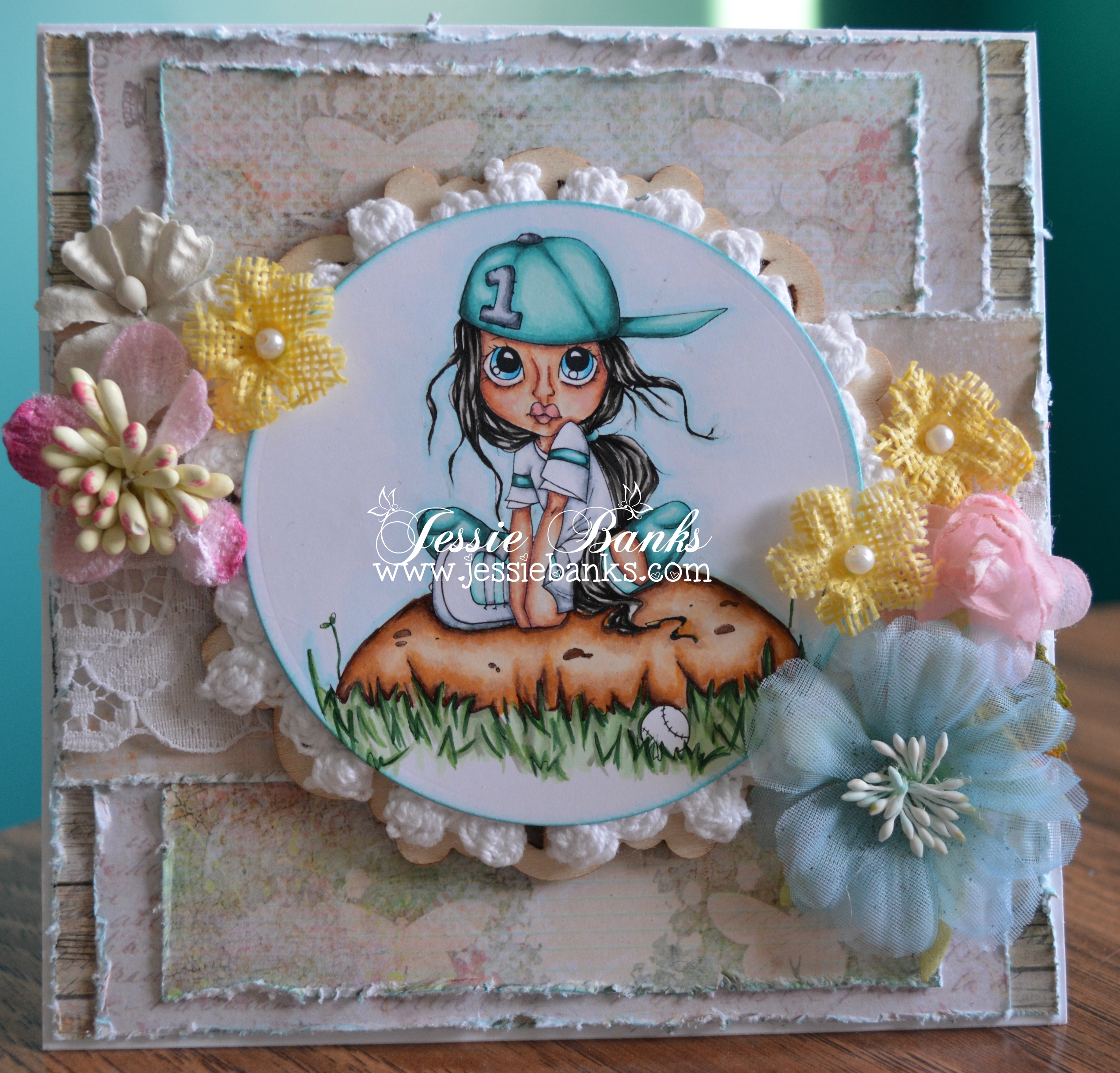I coloured this image up with my copics and used a fun technique where I selectively die cut the image into a circle allowing the balloon to continue outside of the circle. Layered patterned paper, trim and flowers finish the card off.