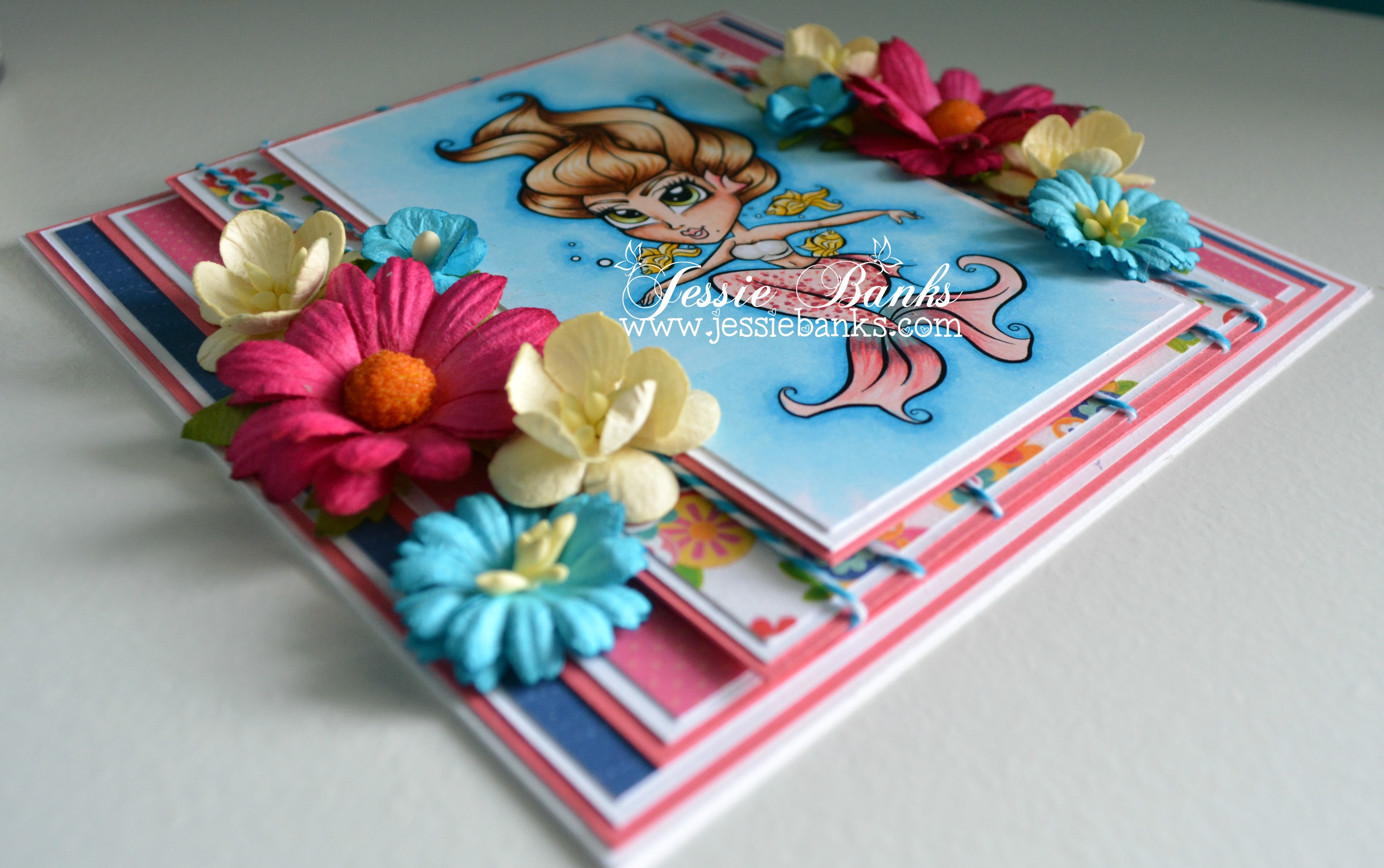 Layered patterned paper, seam binding, enamel dots, and a ton of flowers (I may have gone a little over board) finish off the front of this card,