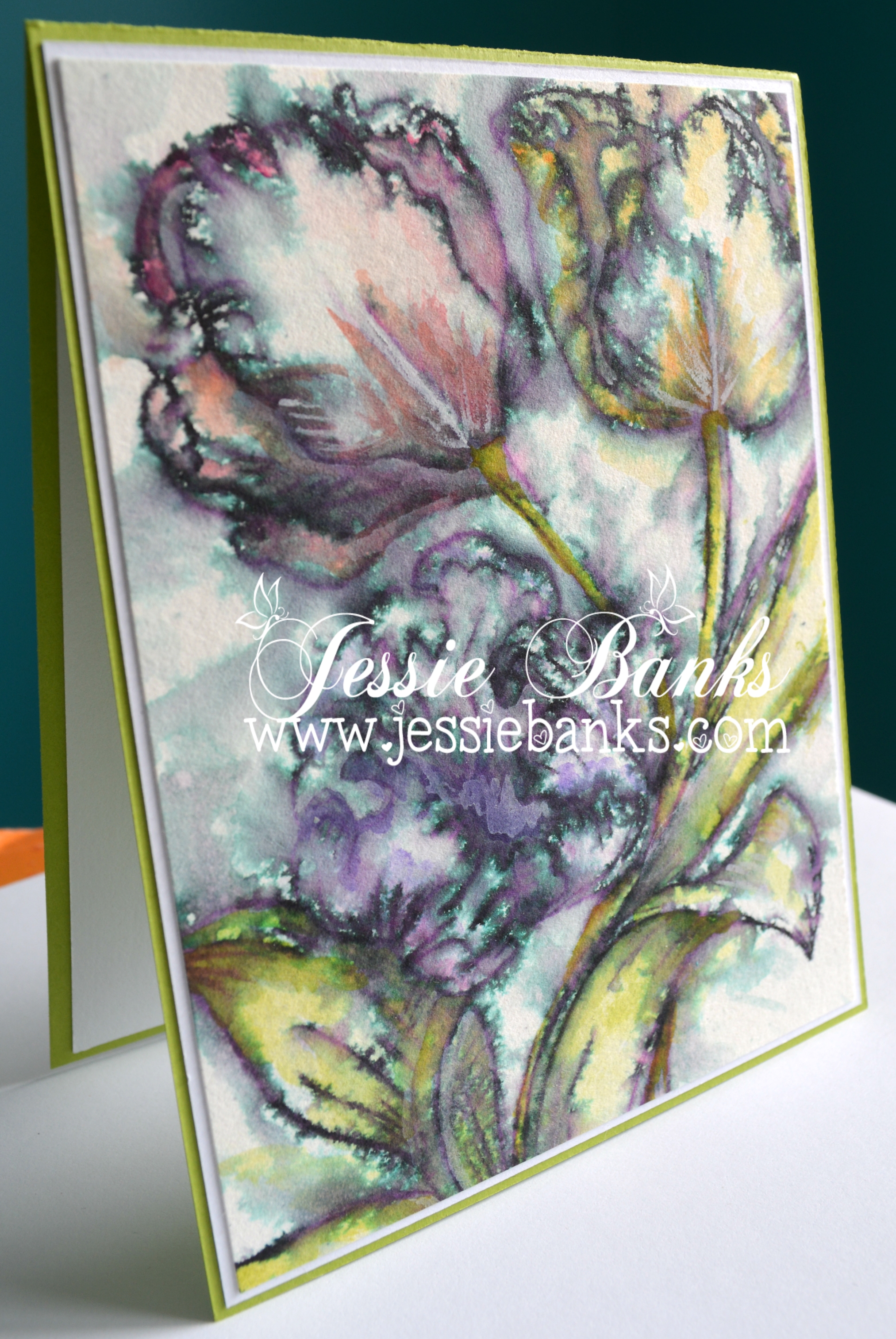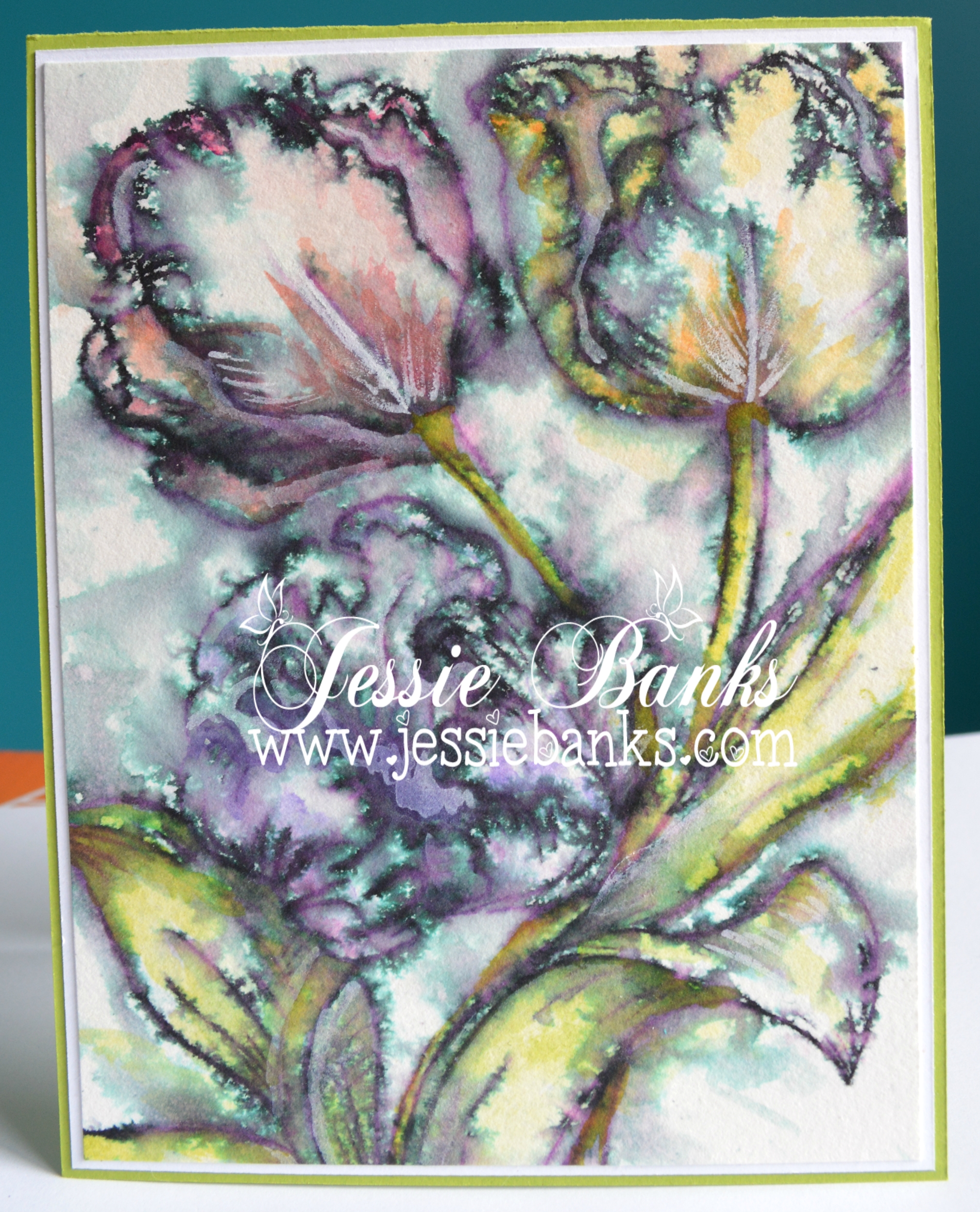 Some clean layers of patterned paper, curly stamens, chrysanthemums, cosmo daisies, and sweet heart blossoms finish off the front of this card.