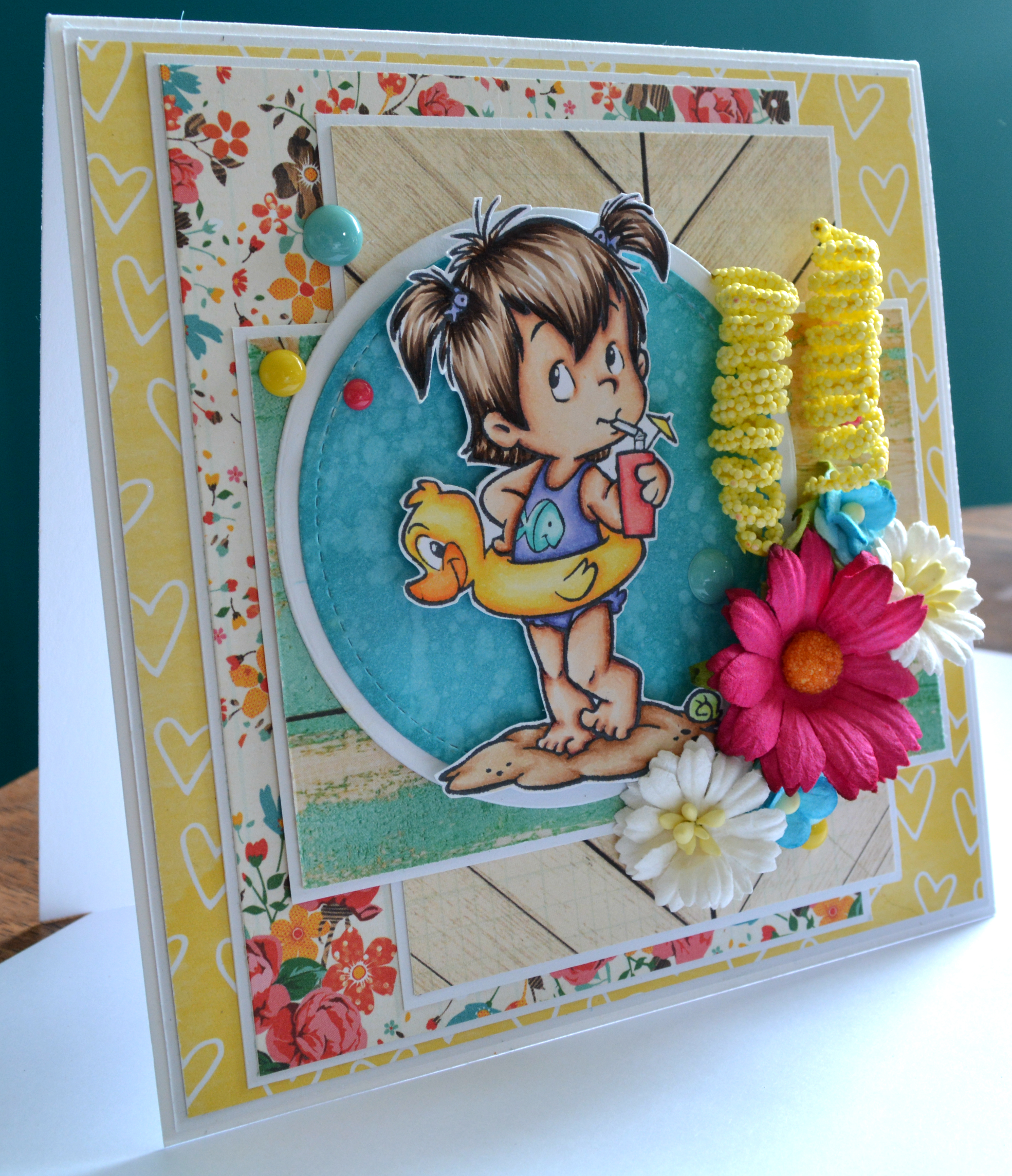 Hey everyone! Hope you all have been doing well! Today’s card features Roberto’s Rascals Beach Babe Twila, I coloured her up with my copic markers.