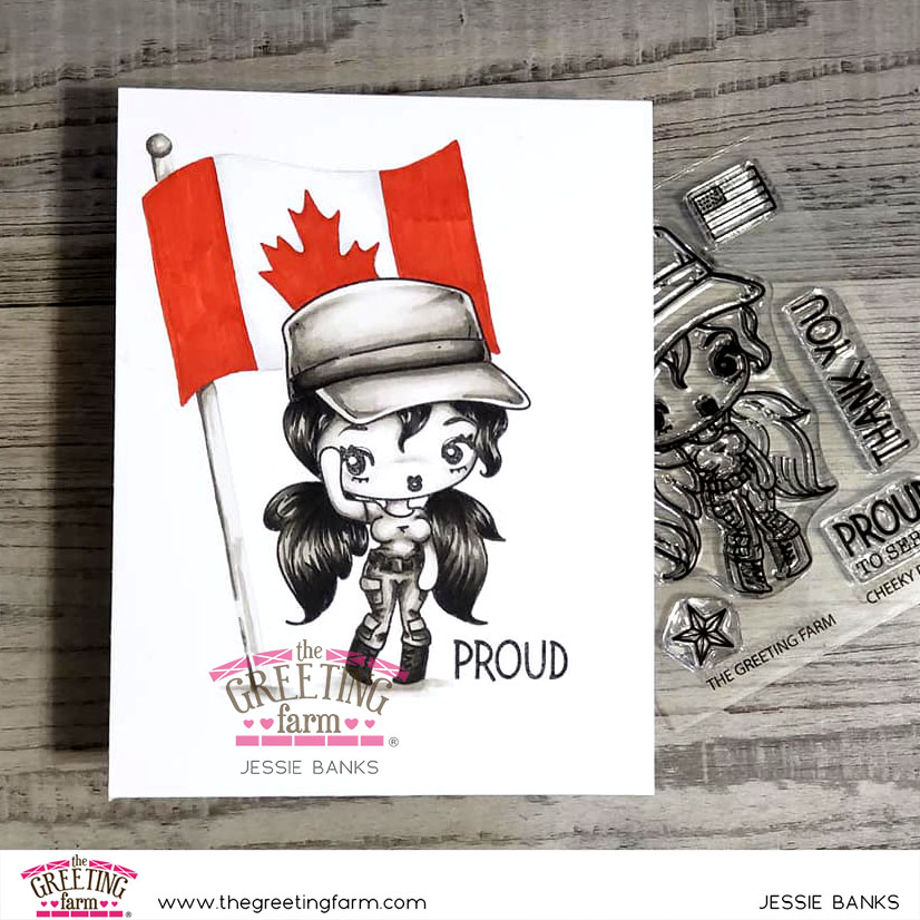 I used the Cheeky Proud set for my card today, I coloured up our lady with some warm grey markers, then drew in a big Canadian Flag behind her and make that the only colour piece on the card. I love how this one came out and thought it would be fun to show you how this image can work for you no matter what country you call home!