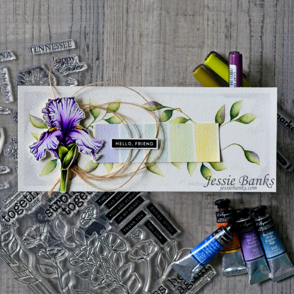 I used my Mother’s Day present (Senellier watercolour paints) to paint up the leaves in the background as well as the paint swatches. But for the gorgeous Iris from the Stately Flowers 8 set was painted using the Karin Brushmarker Pro’s.