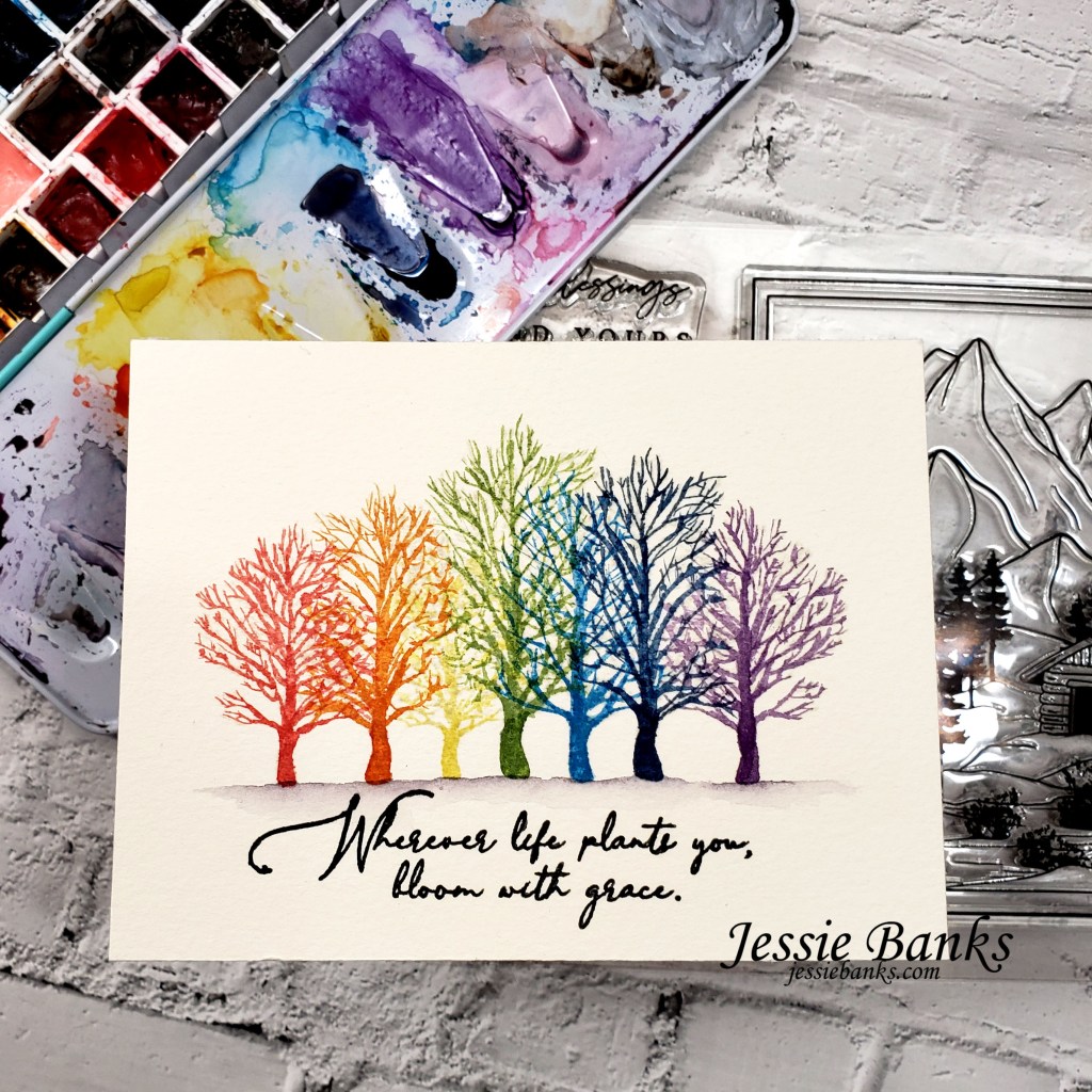 Keeping with my typical style and brain of not following the theme of any stamp set. When I saw the Peaceful Christmas set and the row of trees in it, immediately I saw rainbow! Even before counting that there were 7 trees in the line, could it have been more perfect for a rainbow row of trees!