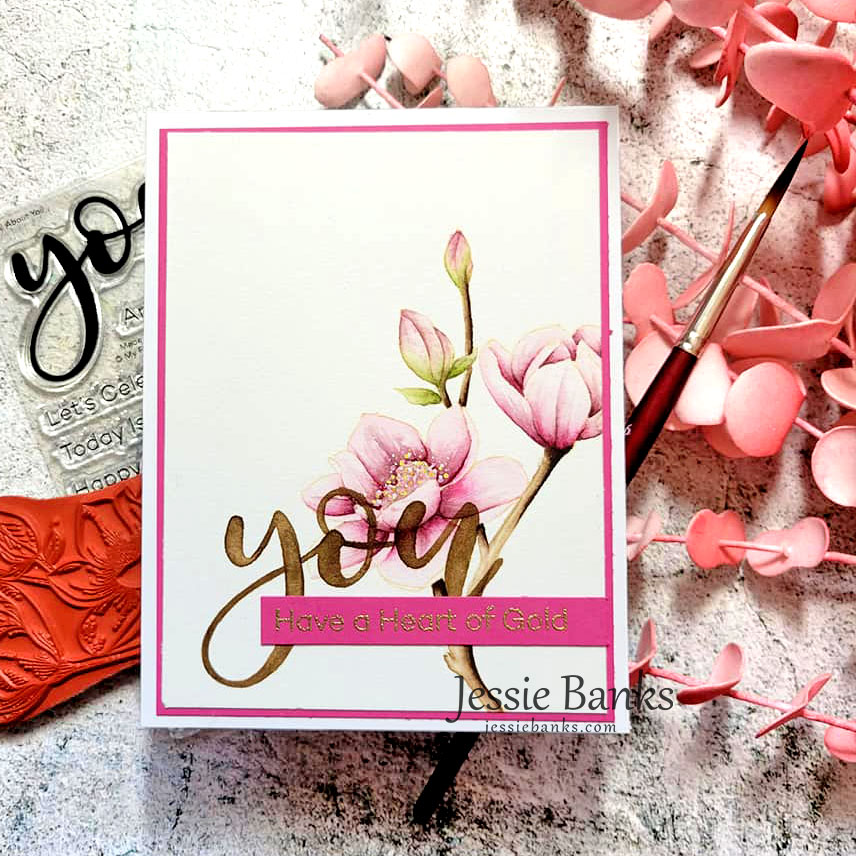 I then pulled out the All about you set and stamped the “you” in my antique linen Distress Ink then watercoloured over it with a brown. Stamping the rest ofthe sentiment on a co-ordinating cardstock and embossing it in gold finished off this clean little card!