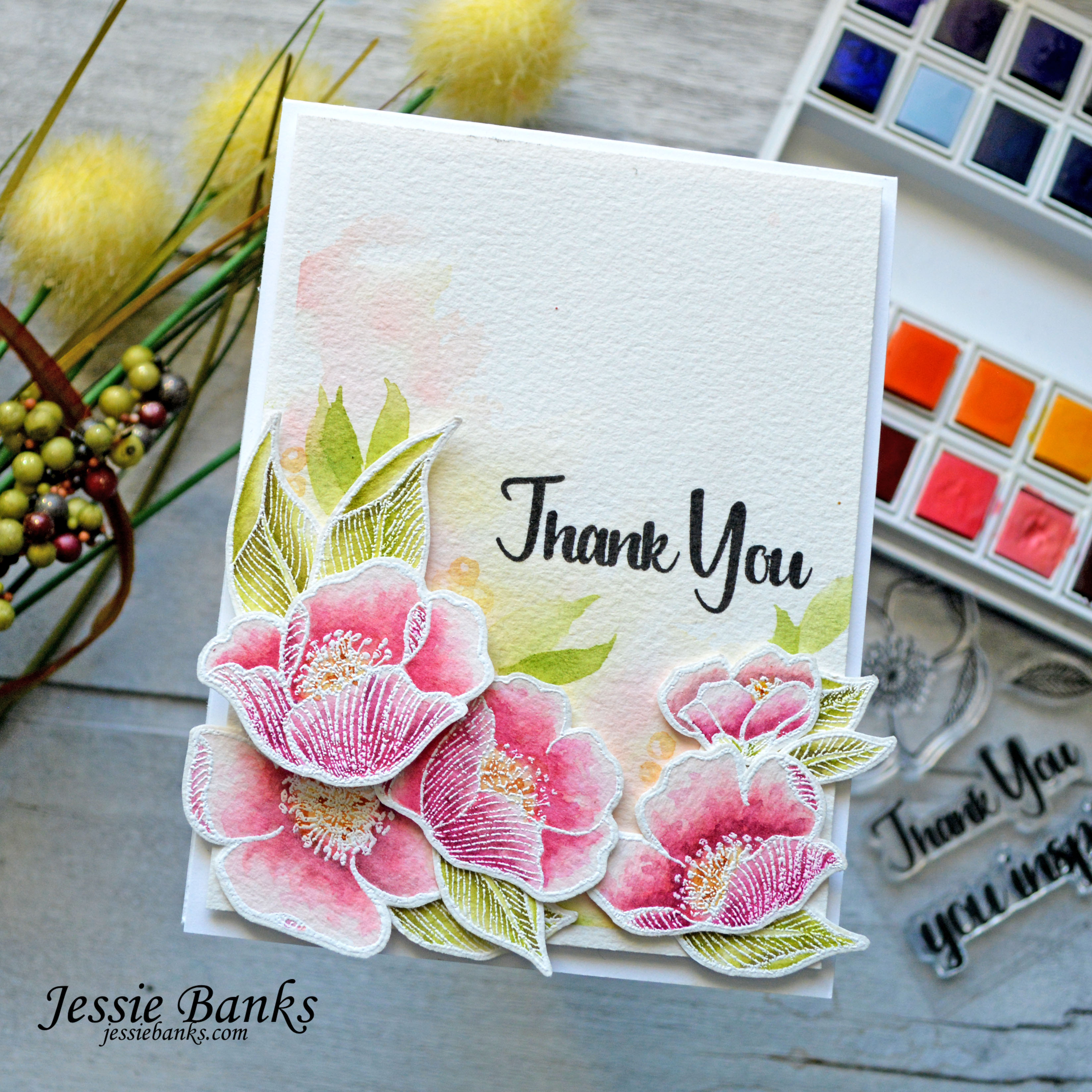 I stamped and embossed the flowers, then painted them up with a bunch of the pinks and greens in the watercolor set.