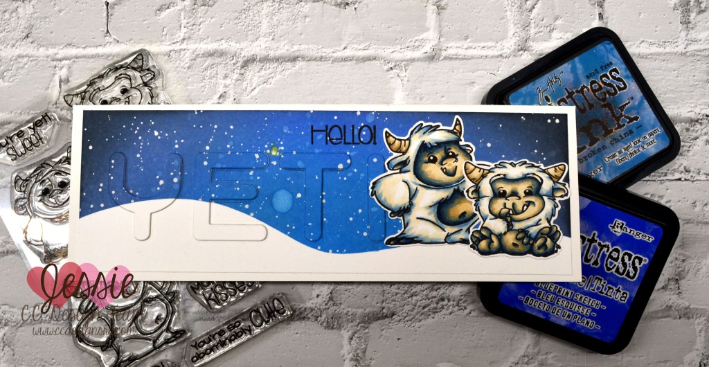 I masked off the bottom snow hills, then used distress ink and gouache to create the sky. Die cutting the word Yeti out and using it with the eclipse technique and adding the stamped hello above it finished off the background. Popping up two of the yeti’s from the Abominable set up on top finished it off!