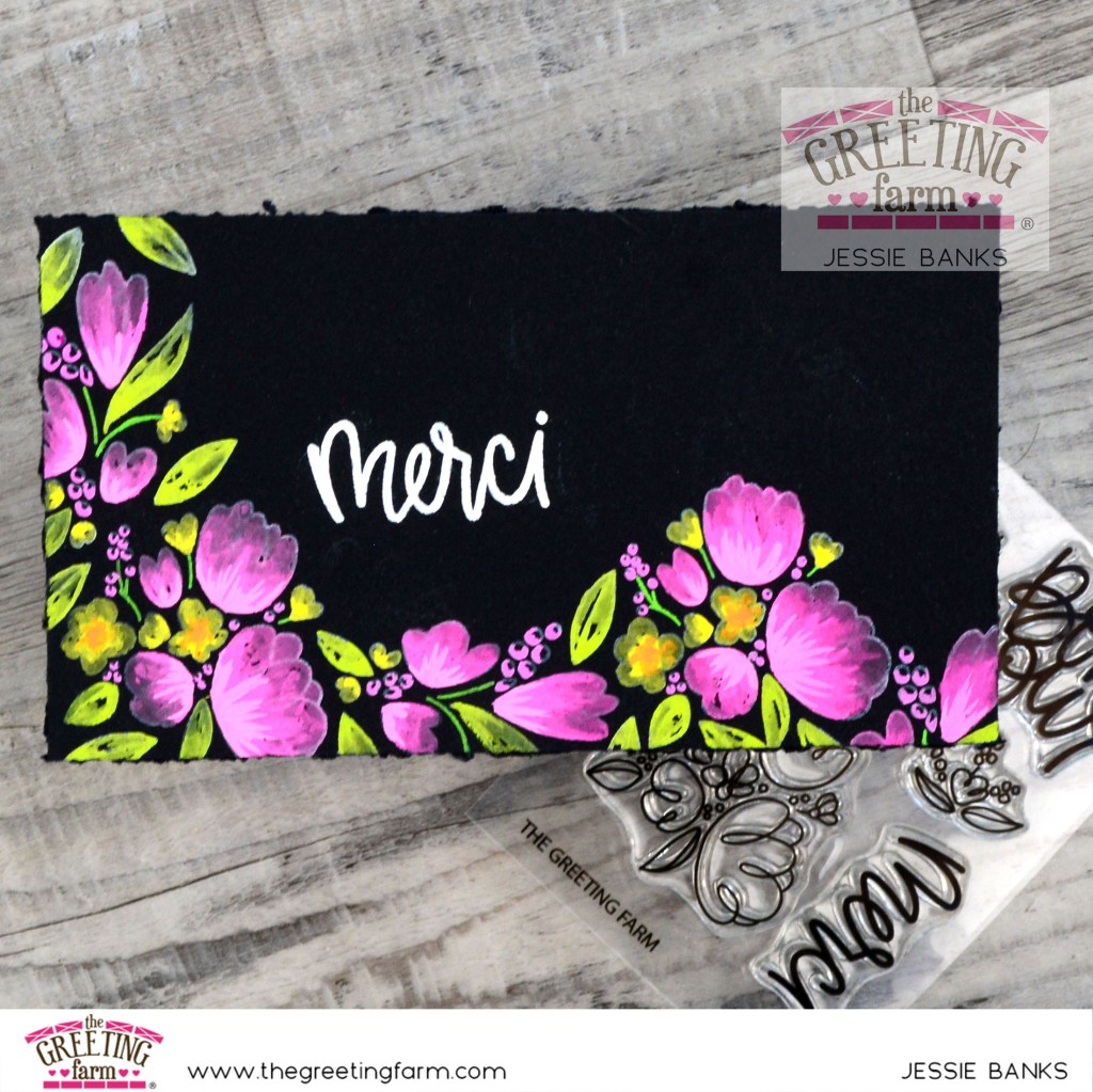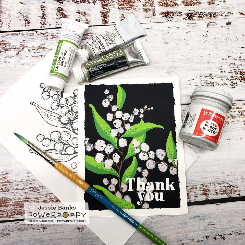 I took the Bouquet set and stamped it out with white ink on some black watercolour paper, I then pulled out my small supply of gouache. Something new I am playing with and really enjoying the looks I can get with it! I enjoyed being able to layer light over dark on the flowers in this card!