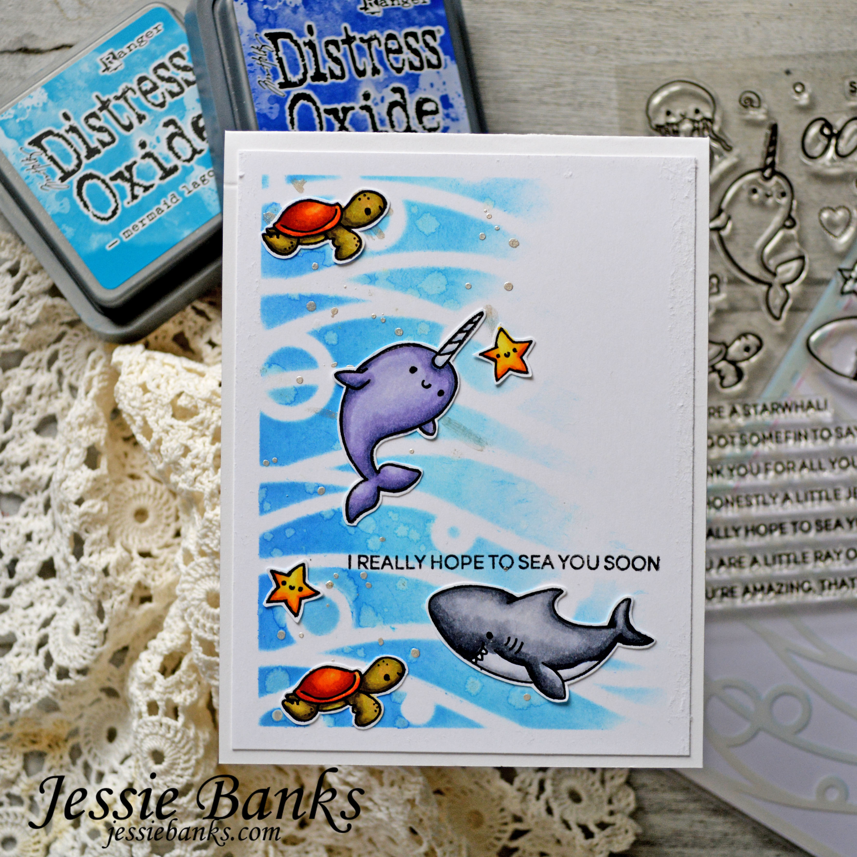 I coloured all these cute little sea critters up with my copic markers. Fussy cut them out, then added them onto a stenciled background.
