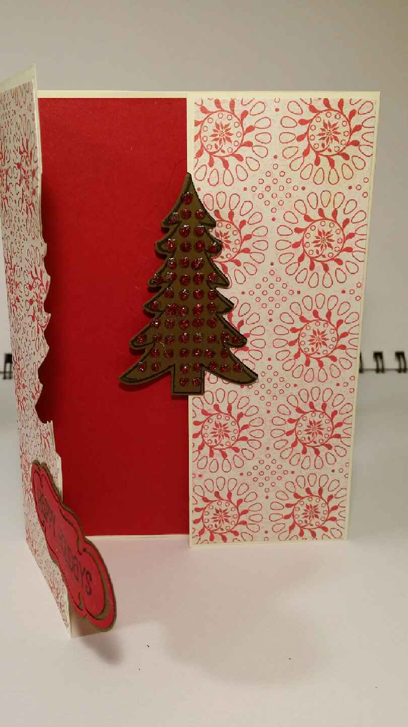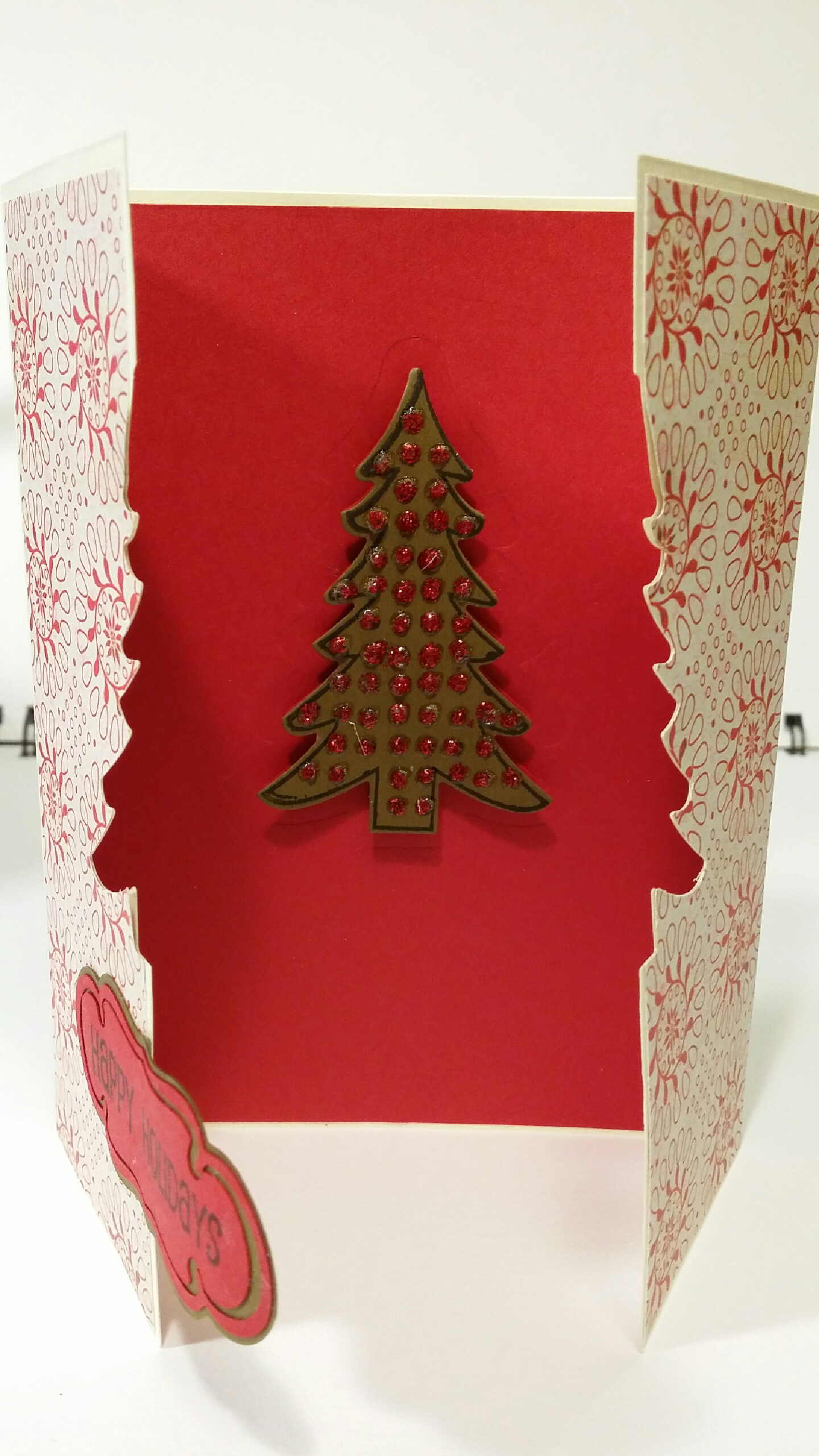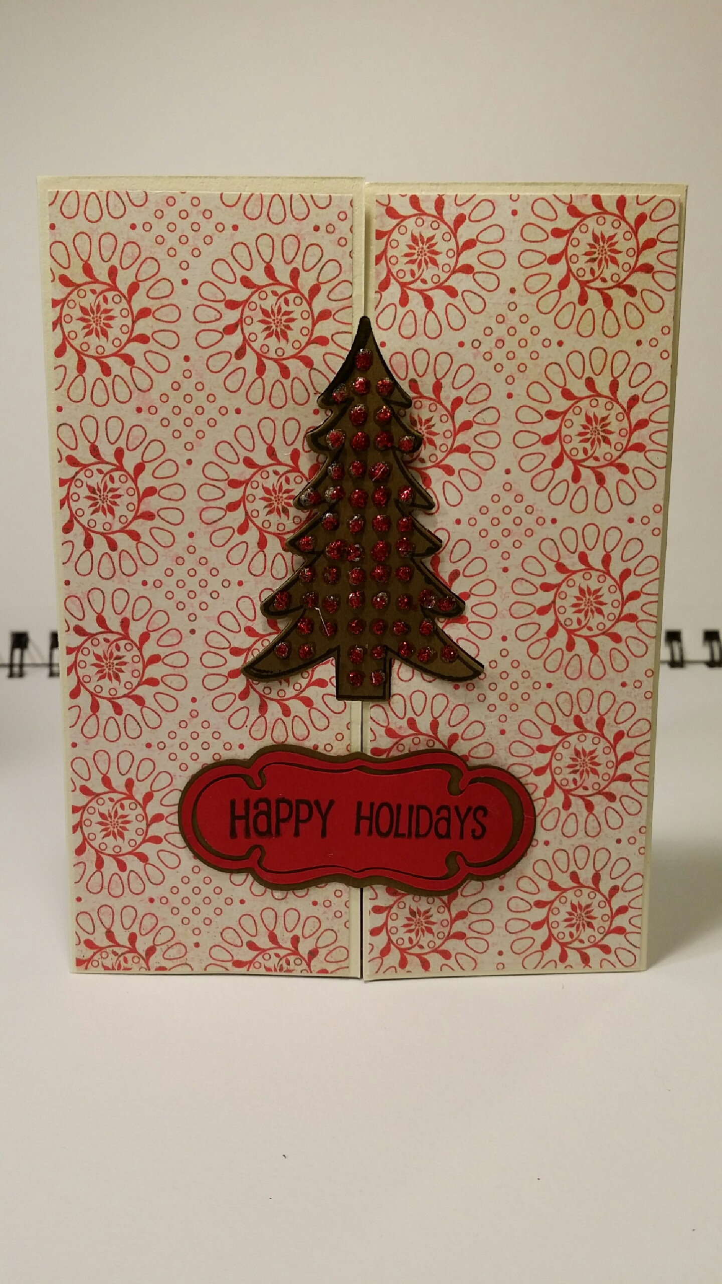 I used the Elegant Embellishments by Anna Griffin for Cricut, Hampton Art 6 pcs die and stamp set (SC-664). The tree is green card with Crimson Zazz, and the tag is green and red card, outside panels are from Basic Grey’s Aspen Frost (cut at 5 3/8 x 2 18)